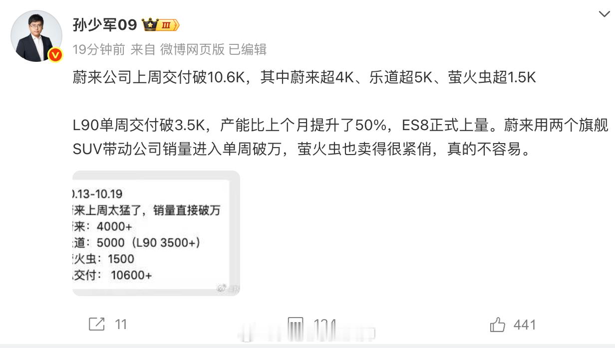 透露称,蔚来公司上周交付破10.6K,其中蔚来超4K、乐道超5K、萤火虫超1.5