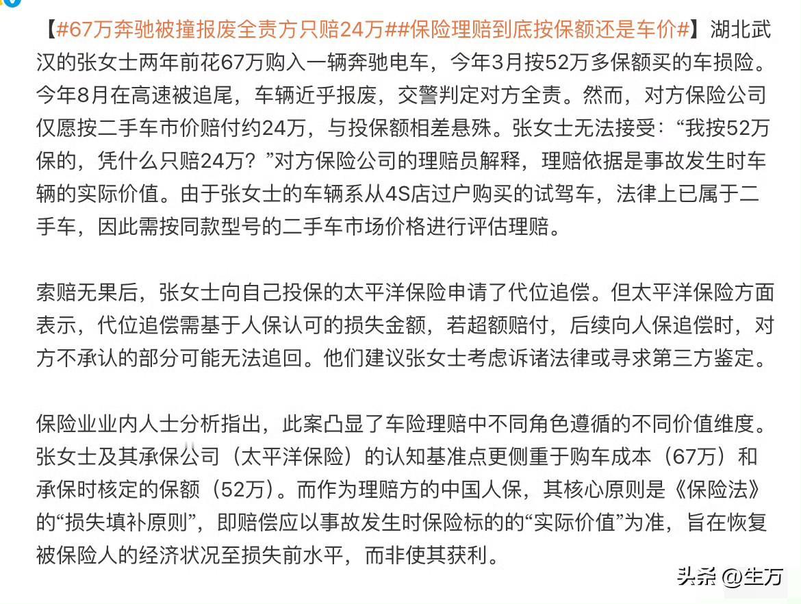 贪图便宜的张女士,花了67万,买了奔驰的电动车,他买的是试驾车,为了贪图那几万块钱的便宜,现在损失好几十万: 但是现在保险公司只是给好赔了24万[捂脸]先不说好曾经为什么愿意花600,000多块钱去买一个奔驰的电动车! 很多人都理解不了,她为什么要买一个人人都在开的试驾版本的电动车,本来几十万都舍得花,一定要节约那几万块钱买一个残次品,结果现在出了交通事故,人家保险公司给他预算折价直接三分之二[捂脸],所以张女士现在头都大了! 因此,有人建议,要不直接修吧,因为根据现在来看,修下来要53万,那么双方都不将就谁,这样也挺好的! 不过实话实说,这个钱是买一个问界M9,还可以剩几万块钱,慢慢地充电,而且现在这个车的辅助驾驶系统是有目共睹的,难道她平时都不看任何关于汽车方面的新闻吗?朋友也没有劝她过吗[捂脸],真的搞不懂他为什么执着于奔驰这个标,可能跟每个人的行业不一样吧,有些人人确实需要这个标志去撑场面。 不知道这个女士,是不是不懂得我们国产电动车,其实已经很不错了,但是没有办法自己的东西再好,也架不住奔驰这个标它的魅力。 所以有一部分人让他袪魅,可不是一件简单的事情!