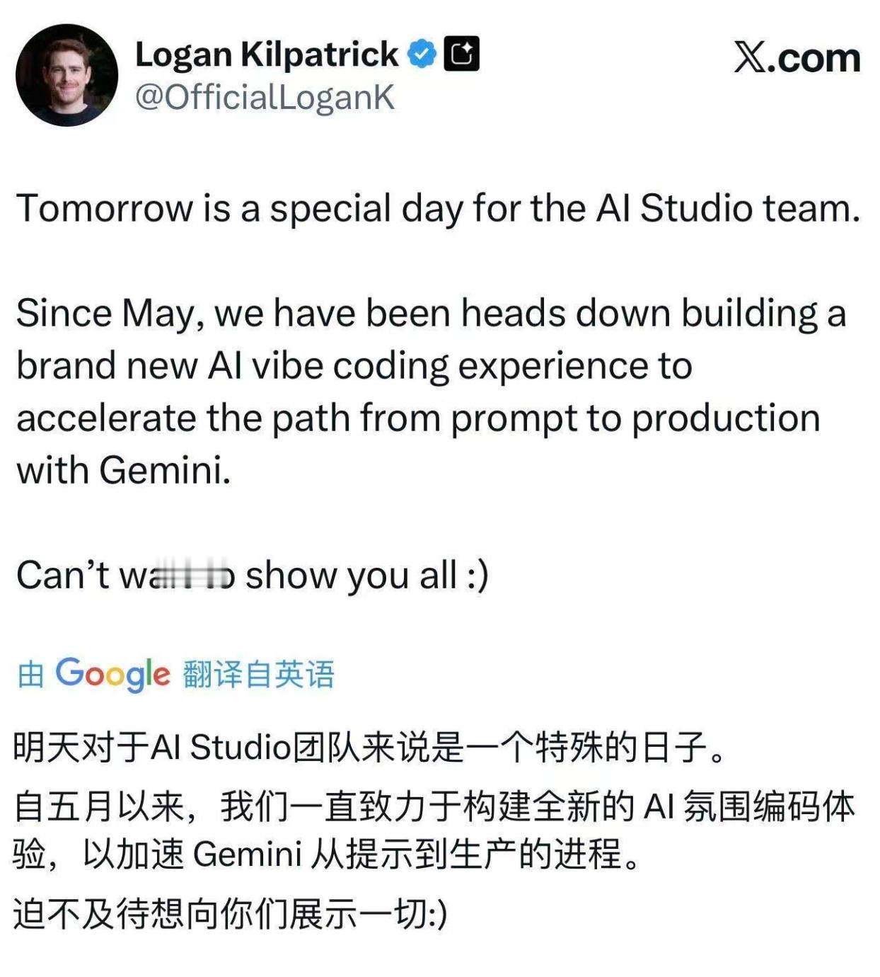 Google AI Studio团队成员Logan发布推文,明天是特殊日子,这几乎就是在官宣Gemini 3要来了。从5月份到现在,Gemini团队一直在秘密打造全新AI编程体验,目标是用Gemini加速从提示词到生产的全流程。