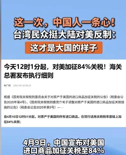 “台湾民众也团结起来了!”看到大陆硬刚特朗普,台湾专家哭了,岛内网友空前团结,随着中方宣布对等反制美方关税,连台湾省都跟着热血沸腾起来了,先辈未曾低头,吾辈岂能折腰? 2025年4月的一个晚上,台湾一家电视台的时事节目正在直播。本来是平常的国际新闻分析,但一位有着多年财经和国际局势解读经验的专家。 在讲到大陆的最新动作时,突然拿起纸巾擦拭不断涌出的泪水。这一幕让现场的气氛瞬间凝固,也让电视机前的观众感到意外。 他的情绪失控,是因为刚刚播完的那段新闻中国大陆在美国宣布高关税不到一天后,直接公布了一份包含多类美国商品的大规模反制清单,关税幅度高得惊人,态度硬得让人心颤。 这种毫不妥协的动作,不仅是在经济层面回应,更是对外释放“可以硬碰硬”的信号。 这一幕从演播厅传到互联网,只用了几个小时,就在台湾社会引发了一场情绪共振。在社交平台,新闻被成千上万次转发,评论区里“不能低头”“要有骨气”这样的字眼频繁出现。 一句“先辈挺过压力,我们也不能弯腰”迅速刷屏,仿佛成了当天岛内的共识。 这种反应并不是单纯的网络热闹,而是有现实基础的。就在大陆反制美国的同时,美国也对台湾的部分出口商品加税。 相比之下,大陆的快速反击显得鲜明而直接,这种反差,让不少台湾民众自然而然地产生了钦佩和认同。 随着讨论不断升温,历史的影子开始被搬上台面。许多人回忆起过去民族在外来压力下的坚韧,那些不肯低头的故事,不是教科书里的空话,而是在今天再次被验证的精神。 对于很多台湾网友来说,大陆的硬气不仅是一种外交策略,更是一种情感上的引领,让他们在同样的困境下找到了一种来自血脉深处的共鸣。 这场情绪的爆发,其实是一次经济博弈带来的副作用。美国的贸易政策早在几年前就开始收紧,反制中国的目标也从贸易逆差延伸到科技与产业链去中国化。 到了2025年,美国试图用更高的关税逼迫对手让步。但中国的回应清楚地表明,谁端出压力,谁就得承受反击。 这种不退让的姿态,让海峡另一边的人看到了面对强权时该有的样子,也让短时间内的舆论在岛内空前一致。 这不仅仅是一次经济事件引起的情绪波动,更像是一场提醒海峡两岸无论现实如何分歧,当面对共同、并且足以触动民族尊严的挑战时,连接两边的那条看不见的纽带仍然存在。 岛内的网友在评论里写下:“平时很多事我们意见不同,但这次我愿意说,硬气值得尊敬。”这样的声音,在那几天的网络里并不少见。 或许这正说明,历史留下的精神,不会因为距离和时间而消失,只是需要一个契机,再次让它回到人们的心里。