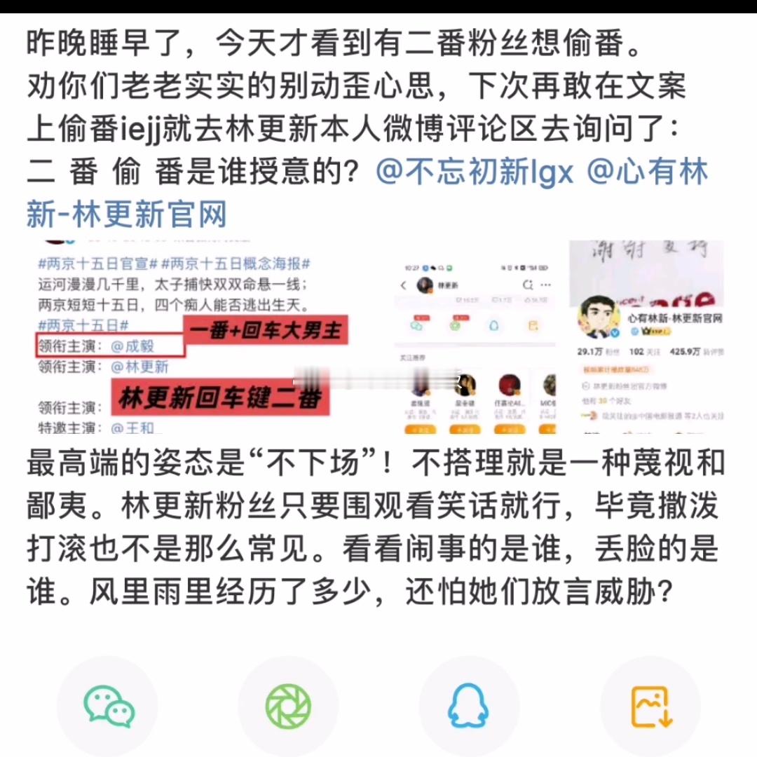 两京十五日官宣阵容,林更新二番官宣后,林更新粉丝认为林更新也是男主,并且在各大评论区都在说自己是男主,于是引发成毅粉丝质疑,认为林更新这边是在“偷番”,要求林更新粉丝还有剧集那边都要严格把控好番位问题,而林更新粉丝觉得没必要下场争论[思考]