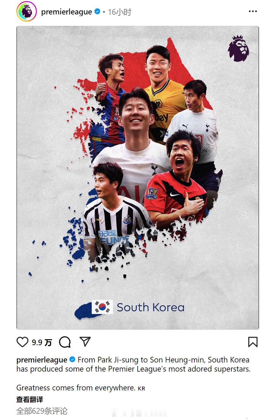 英超官方列举了曾经驰骋英超赛场的韩国球员,配文道,“从朴智星到孙兴慜,韩国诞生了多位英超最受喜爱的超级球星。伟大,来自世界的每一个角落。🇰🇷”