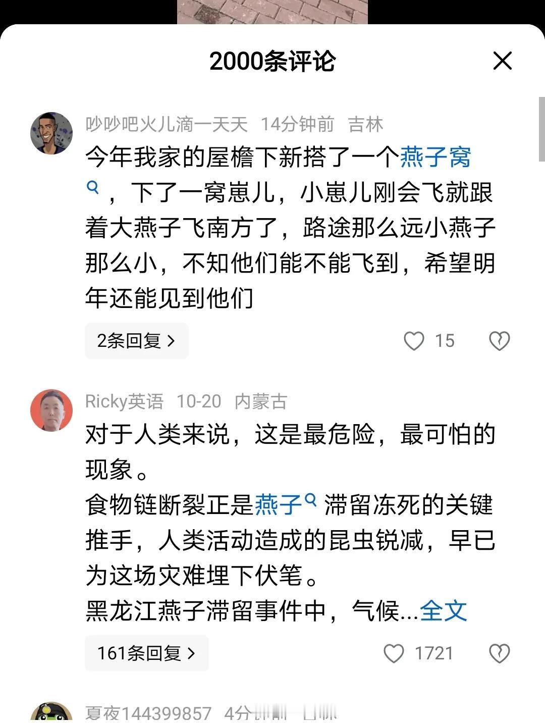 家人们,今天看到个挺稀奇又有点揪心的事儿啊! 最近东北的网友们发现,本该早就南飞的燕子,居然还滞留在东北呢!好多燕子扎堆在屋顶、电线杆上,甚至有的还钻进了工地宿舍。往年9月燕子就该走了,可今年10月寒潮都来了,它们还在。 有的燕子已经被冻得缩成一团,还有的甚至被冻死了。专家说,今年东北入秋气温下降慢,昆虫多,燕子食物充足,就误判了迁徙时间,结果寒潮突然来了,它们没储备够能量,迁徙之路又有暴雪,就只能留下了。 这事儿真让人感叹,大自然的变化对动物影响太大了。咱们人类也得好好爱护环境,减少对气候的影响,不然不知道还有多少动物会受影响呢。希望这些燕子能顺利熬过这个冬天呀!燕子