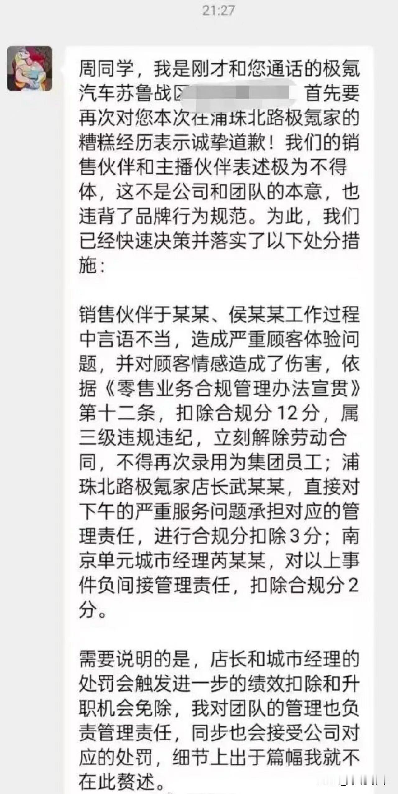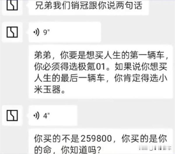 刷到极氪销售诅咒买小米 YU7 车主的事,真刷新认知了。顾客说小米懂年轻人、情绪价值足,销售就放话 “人生最后一辆才选小米,买的不是车是命”。 好在极氪处理够快,涉事销售直接开除,连店长都被处罚。这事儿也暴露行业通病,不少销售总拉踩竞品,“白送都不要” 是常听的话。 卖车靠产品力和真诚不行吗?诅咒客户既丢饭碗又败品牌口碑,纯属自毁操作。