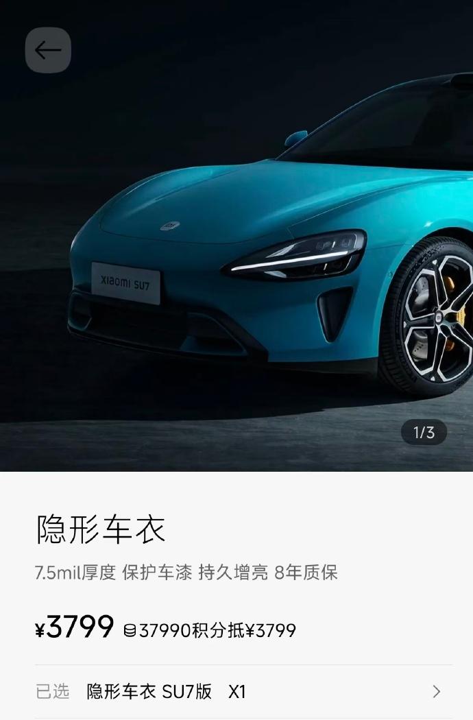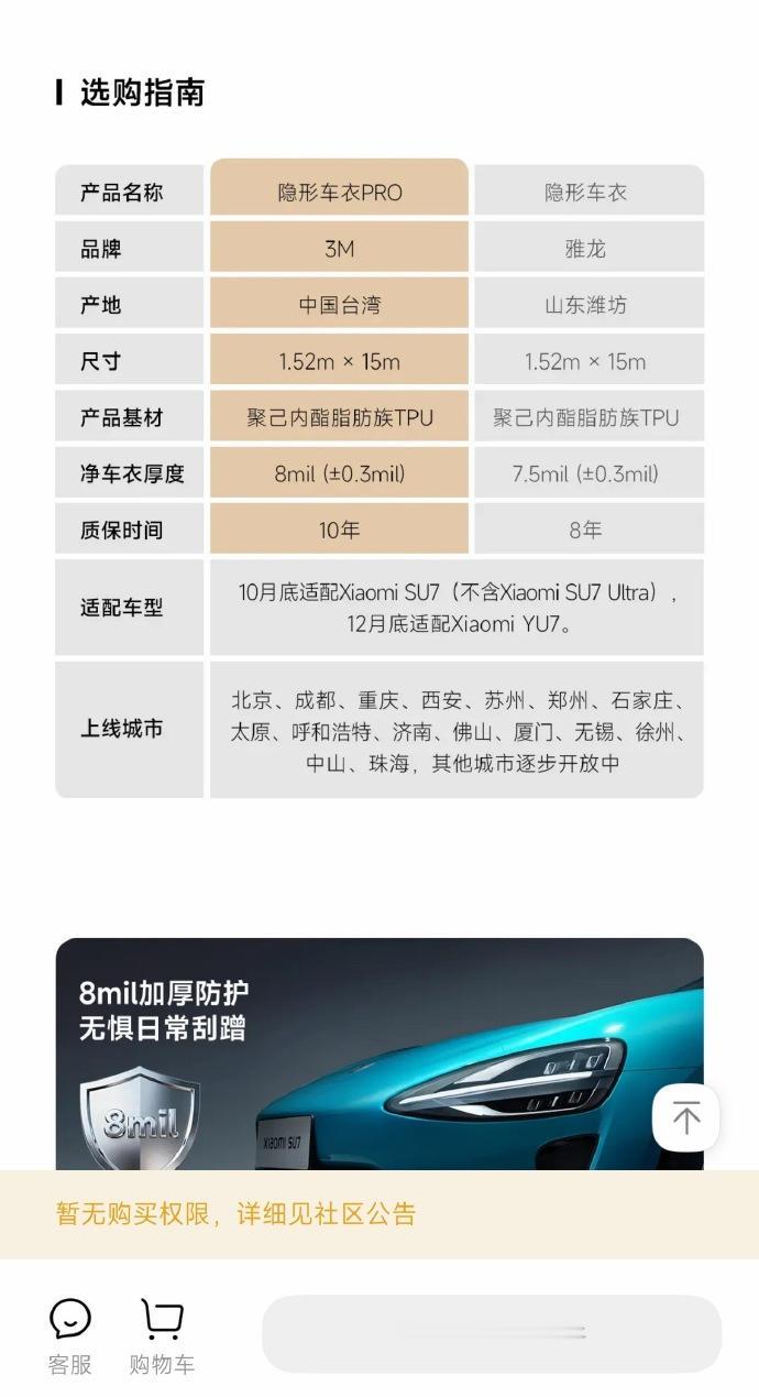 小米官方隐形车衣上线,3799元起 小米汽车近日在官方商城上线了两款隐形车衣,标准版售价3799元,Pro版售价8999元,为车主提供了新的漆面保护选择。 标准版厚度为7.5mil,提供8年质保;Pro版厚度增至8mil,质保期延长至10年,并增加了抗石击、疏水疏油功能。首批服务已在16个城市开通,预计10月底适配SU7车型,12月底适配YU7。 官方承诺提供标准化施工流程和电子质保,解决了第三方贴膜质量参差不齐的痛点。这个定价在官方车衣中颇具竞争力,为小米车主提供了更省心的选择。【来自懂车帝车友圈】