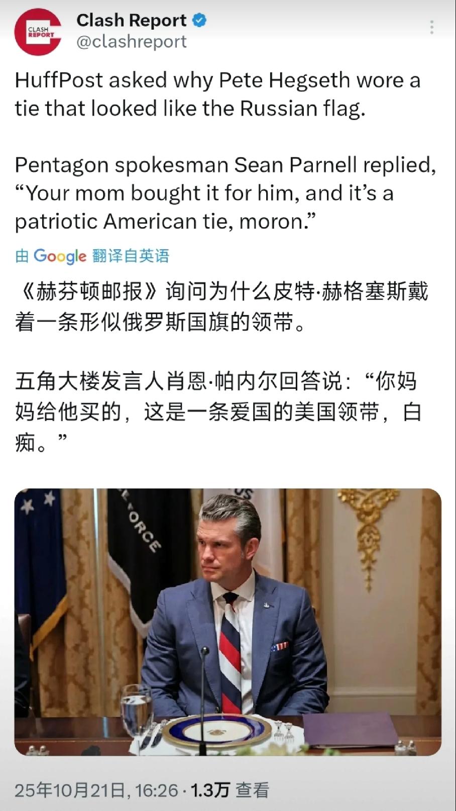 赫格塞斯为什么戴形似俄罗斯国旗的领带?五角大楼给出“真相”:你妈妈给他买的 看完是不是想怼我? 别,这不是我说的,这是五角大楼回答外媒提问时说的,后面还有两句,我嫌磕碜,没打上去,想看的朋友,看图。 我想说的是,这文明吗? 文不文明不知道,但是自由肯定是有了,五角大楼学习了白宫的好传统。 只是,为什么会这样呢? 我粗浅的看法是,焦虑,这种焦虑正在西方精英层蔓延,而带来这种焦虑的原因,就是自己再也不能像以前一样,任性。 你想,贝森特都破防了,何况这些发言人呢? 这至少印证了一件事儿,这是一个草台班子……