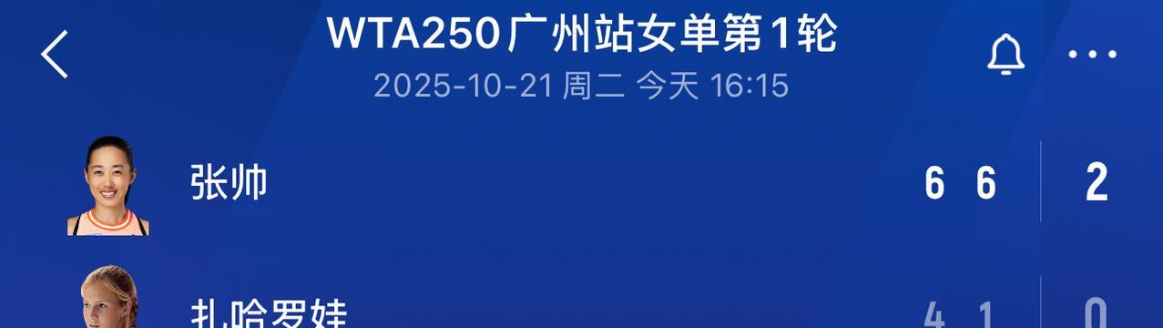网坛不老松、虽老而弥坚!祝贺老将张帅WTA250广州站女单首轮“二擒”俄罗斯“狠女”扎哈罗娃![鼓掌][鼓掌][鼓掌] 今天下午,WTA250广州站女单首轮,中国老将张帅再遇WTA单打排名第84位、以打法凶悍著称、年仅23岁的俄罗斯“狠女”扎哈罗娃。在前不久刚刚结束的中国网球公开赛首轮,张帅曾经在先输一盘的情况下最终以2-1逆转淘汰了对手。 作为知根知底的老对手,今天下午比赛一开始,双方很快就进入了激烈的对攻状态,扎哈罗娃也抱着必胜的信心誓要一雪前耻!可惜天公不作美,比盘第一盘进行到第四局因下雨被迫暂停,此时张帅在本盘先发被对手先破一局暂时以1:2落后,雨停比赛恢复后,张帅稳住阵脚、稳扎稳打,连破对手三局,最终以6:4拿下了第一盘,大比分1-0领先对手。 第二盘,张帅先发1保1破、2:0领先,扎哈罗娃马上在第三局也实现回破,局分战至2:1、张帅领先,随后张帅一鼓作气,又是2保2破,以6:1轻松拿下了第二盘。从而以大比分2-0再次淘汰扎哈罗娃,成功挺进广网第二轮。