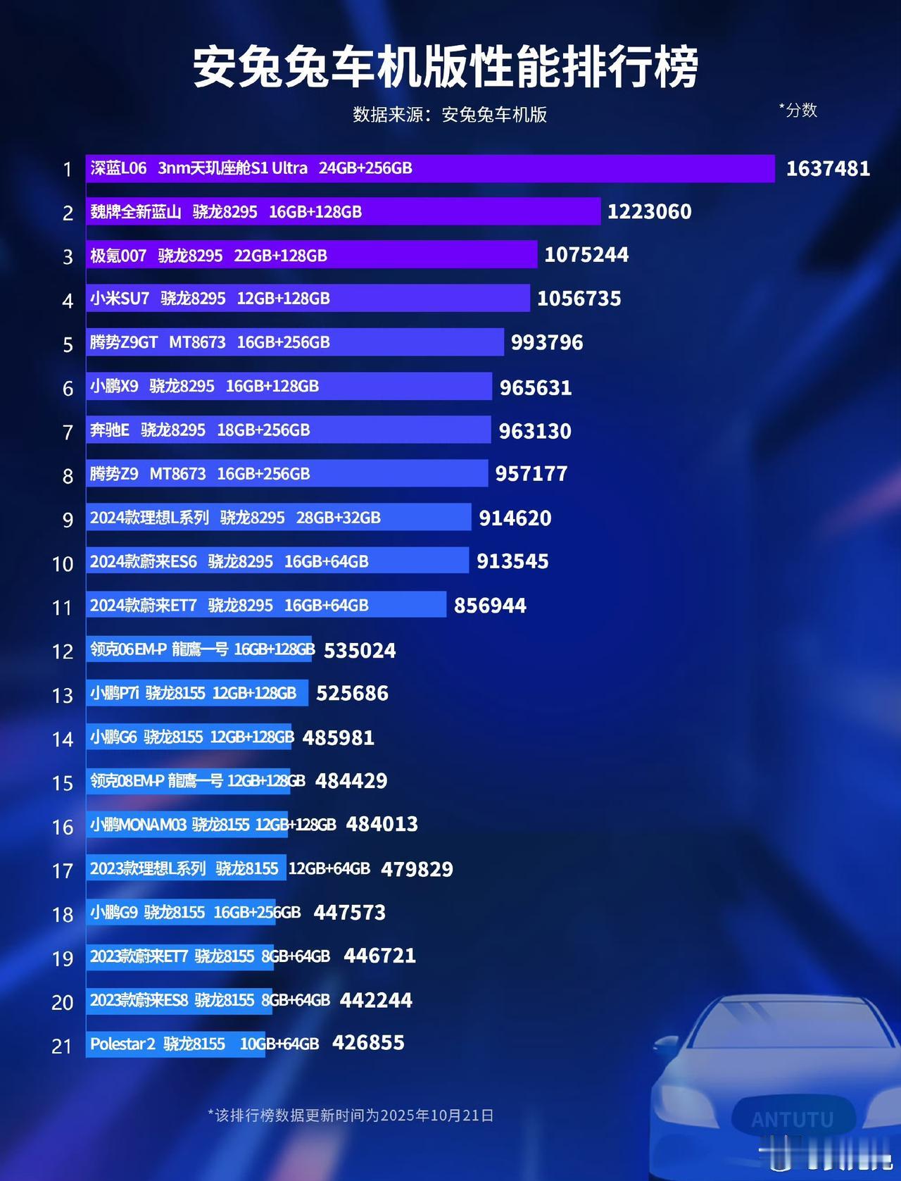 陈震: 真猛!智舱稳了,接下来就要看看智驾表现! 今天晚上,陈震分享了安兔兔官方发出来的一组车格跑分数据,没想到名不见经传的深蓝,居然以163,000多分的成绩,稳稳地拿到第一名,关键是他这个分数与后面的可以说是形成的比较明显的对比! 由于他用的是三纳米的天玑ultra,所以要比以前主流的骁龙系列,优势是非常明显的。 排在后面的分别是蓝山、极氪、小米、腾势、小鹏。 当然,另外一个热门版本的超级排行当中,深蓝也在榜一稳稳地站着,下面除了小米之外,分别也是理想蔚来和小鹏。 这个芯片就相当于人的大脑一样,反应速度的快慢决定了一切,接下来综合表现怎么样还得配合他的系统,以及硬件的结合。 所以单方面快只能说是在某一个方面有优势,综合来看的话不是这么简单,还得看软硬件的配合,尤其是辅助驾驶系统的成熟度。