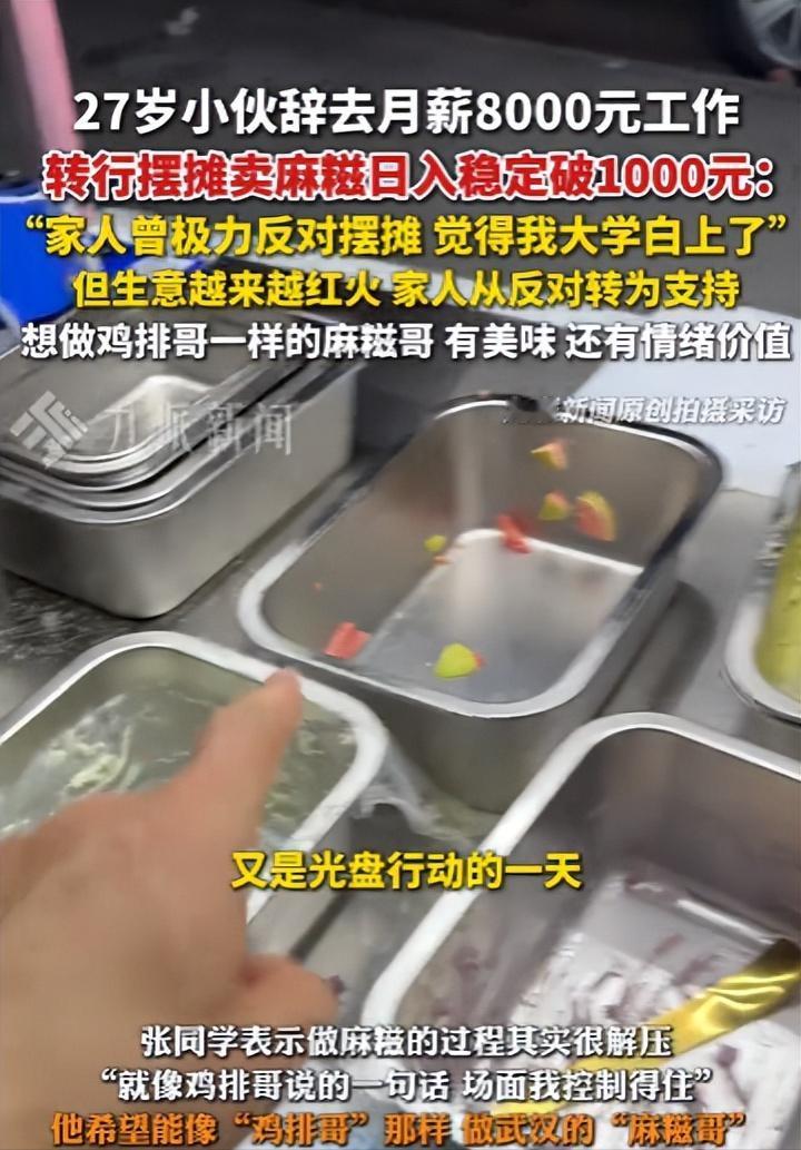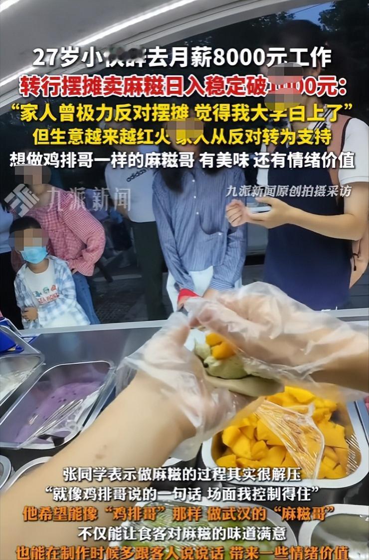 “活该他发财!”10月20日报道,湖北武汉,一27岁小伙不顾家人反对辞去了月薪8000元的稳定工作,转行摆摊卖起了麻糍,没想到生意越来越红火,日收益稳定破1000元,小伙表示自己想像网红一样做成“麻糍哥”,网友:这是从打工人变成小老板了![紫薇别走] 张同学在湖北交通职业技术学院毕业后,在宁波一家汽车装饰建材公司做销售,月薪8000元,工作稳定,在父母眼里这就是理想的生活轨迹,但他总觉得少了点什么,每天重复同样的话术、见同样的客户,三年下来存款不少,成就感却越来越少。 他在杭州偶然吃到一家麻糍店,丰富的馅料搭配让他眼前一亮,回去后他花了整整一个月泡在烘焙培训班,从和面、调馅到包装设计,每个环节都反复练习。 当张同学向家人宣布要辞职摆摊时,父亲直接摔了筷子,“读了大学就是为了不用风吹日晒,你倒好,自己往苦日子里钻,”母亲红着眼睛劝了整整一夜,但张同学心意已决,他算过账:宁波租金贵,开店成本太高,不如先从摊车做起试水。 他在宁波杭州湾新区支起了第一个摊位,现实很快给了他一记重锤,新区以工厂和办公区为主,年轻客群少得可怜,每天从早上准备到晚上收摊,忙活十几个小时,流水只有三百块。 扣掉成本、摊位费和三轮车的油钱,一天赚不到一百,最难的是心理压力,父亲的电话他不敢接,朋友问起也只能含糊其辞,坚持了一个多月后,张同学开始冷静分析。 他发现问题不在产品回头客的好评一直很稳定,而在选址,宁波的客群分散,很难形成口碑传播,他想起母校周边有好几所高校,学生消费力强、接受新鲜事物快,更重要的是自己熟悉那里的每条街道。 重新开张的第一周,张同学每天只睡四个小时,他把摊位选在学生公寓和小吃街之间的必经路口,下午五点准时出摊,正好赶上晚饭后的客流高峰。 为了吸引眼球,他特意把三轮车刷成粉色,还设计了卡通招牌,更关键的是口味创新,他开发了十几种组合:芒果配杨枝甘露奶酪、草莓配巧克力酱、芭乐配茉莉青提,还可以加奥利奥碎、薄脆、椰蓉或肉松。 一个女生发的探店视频在校园论坛火了,视频里,张同学一边制作麻糍一边和顾客聊天,笑容真诚自然,“老板是个有故事的人”成了话题,接下来每天排队的人越来越多,流水从五百涨到八百,再到破千,他开始需要提前备更多原料,粉色摊车成了小吃街的标志性景观。 生意稳定后,母亲悄悄从黄冈赶来了,她没说什么,只是默默帮忙洗水果、装盒,张同学知道,这是母亲用行动表达支持,现在两人配合默契。 做麻糍的过程让他找到了久违的专注感,看着糯米团在手里变成一个个精致的成品,听到顾客说“太好吃了”“明天还来”,这种即时反馈是坐办公室永远体会不到的。 以下是模拟的网友评论: “这哥们儿牛啊!能从按部就班的办公室里跳出来,还能在夜市里拼出名堂,日入千元就是实力证明!活该他发财,这份勇气和行动力不是谁都有的。” “真心佩服!现在很多年轻人就是缺这股敢想敢干的劲儿,靠自己的手艺和汗水赚钱,比啥都踏实。希望“麻糍哥”的生意越来越红火,早日开成连锁店!” “这事得看两面,成功的关键在于他做了市场调研,精准定位到高校年轻人,产品和营销都跟上了,创业不是蛮干,思路清晰很重要。” “日入千元是营业额,还得扣除材料、摊位等成本吧?虽然纯利应该也不错,但创业有风险,不能只看表面光鲜,他家人的态度从反对到支持也说明了,做出成绩才是最好的说服。” “深有同感!自己当老板虽然辛苦,但那种对事情的掌控感和成就感,确实和打工不一样,他说的“做麻糍很解压”,我完全能理解,专注做一件事的时候心是静的。” “我去过这个摊!在汉口学院那边,排队人超多,麻糍味道确实不错,老板也挺健谈,支持这种有想法的小生意,希望保持品质,别成了网红就飘了。” “这种毕竟是个例吧?有没有考虑天气、城管、身体健康这些不确定因素?月薪八千的五险一金也是隐性成本,鼓励创业,但别把冲动当勇敢,稳扎稳打可能更适合大多数人。” “怎么说呢,能成功当然好,但我觉得不能一味鼓吹“辞职摆摊”,稳定的工作也有它的价值,关键是找到适合自己的生活节奏,无论是打工还是创业,自己开心充实最重要。” 如果是你,面对一份稳定但可能看到天花板的工作,和一个有风险但让自己心动、且有可能获得更高回报的创业机会,你会更倾向于哪种选择?为什么?来评论区聊聊你的想法吧! 信源:九派新闻