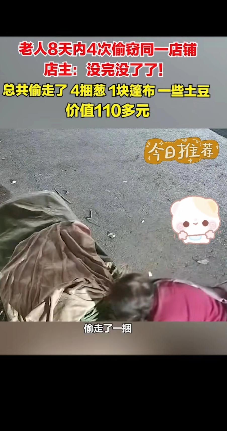 老人8天内4次偷窃同一间店铺! 店主:没完没了了!第一次偷一捆葱,第二次变本加厉成2捆,第三次又偷一捆还顺走遮布,第四次直接偷了一堆土豆。 店主的菜都有数,啥丢了心里门清。 店主实在没辙,把视频公布出来,大妈还戴着口罩,估计也知道这事不光彩。 看来店主也是很无奈,本来看着老人年纪大了!东西也不值钱,不值当报警! 没想到大妈一而再再而三的偷窃,看老板脾气好没有采取任何措施,更加大胆的偷盗,使劲薅店主羊毛! 8天偷4次越偷越大胆,店主如果不曝光,估计老人敢搬光店铺所有的菜! 网友议论纷纷,有人说她和偷饭店铁架子的大爷是绝配,也有人觉得她是本性贪婪。 说不定大妈知道70岁以上违法可不执行行政拘留,但她没学透,连续偷3次以上按刑法也是有说法的。 真希望老人能有点公德心,别这么嚣张!
