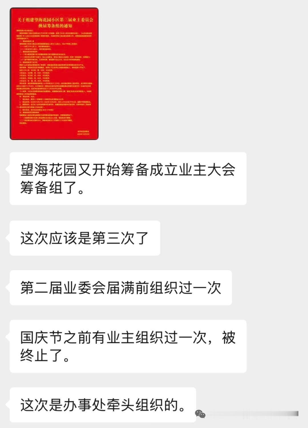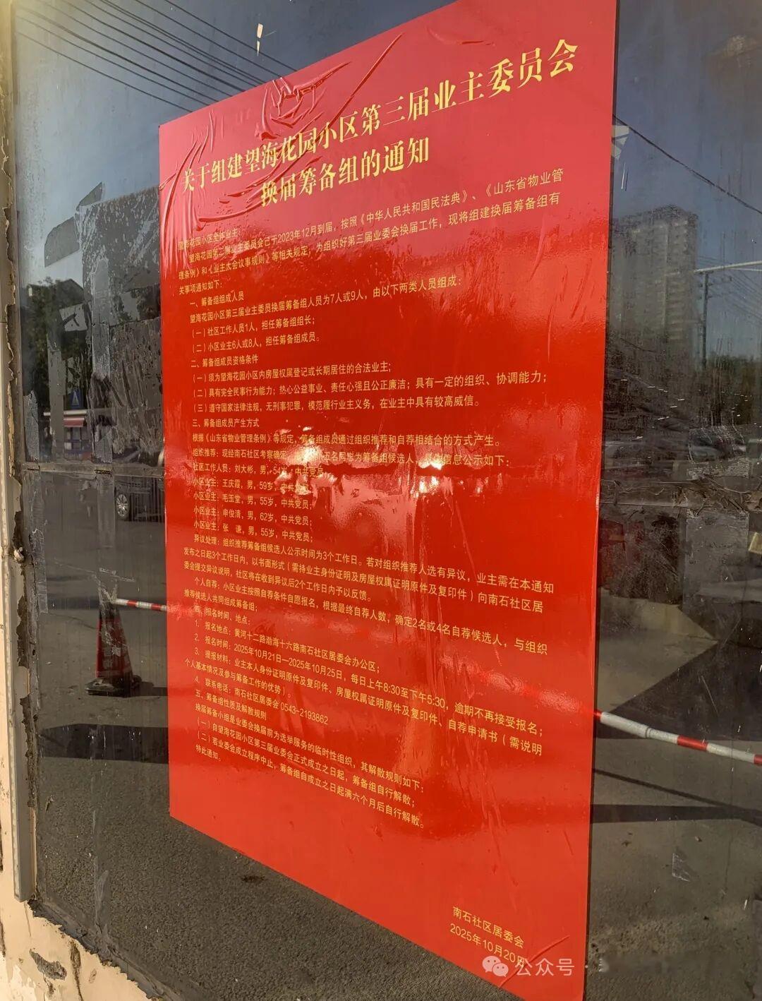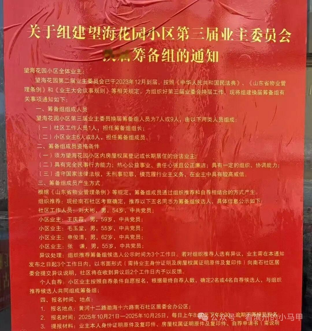 滨州一小区最新通知 10月20日,山东滨州滨城区彭李街道望海花园小区门口张贴公告:《关于组建望海花园小区第三届业主委员会换届筹备组的通知》:(图一) 滨州市滨城区彭李街道南石社区居委会:望海花园第二届业主委员会已于2023年12月到届,按照《中华人民共和国民法典》、《山东省物业管理条例》和《业主大会议事规则》等相关规定,为组织好第三届业委会换届工作,现将组建换届筹备组有关事项通知如下:(图二) 小编在现场看到,该《通知》旁边还有一份今年8月份的《关于终止本次业委会换届工作的通知》,称:由于筹备组候选人意见迟迟未能统一,导致时间已超过规定时限。鉴于以上原因,决定终止此次业委会换届选举工作。经征求部分业主代表意见并结合小区实际,社区将择期重新启动望海花园小区业主委员会换届工作...... 小编在该小区实地查看,内部基础设施和公共道路破损严重、卫生差,还存在一些堵塞消防通道等安全隐患问题。是因小区年数长还是管理不到位,不得而知。但该小区此前曾因更换物业而备受社会关注,一个小区长久存在两个物业公司,也是很少见的一种现象。据投稿业主讲,此番业委会换届筹备组公布的候选人“很有分量”,希望能成功...... 来源 看滨州