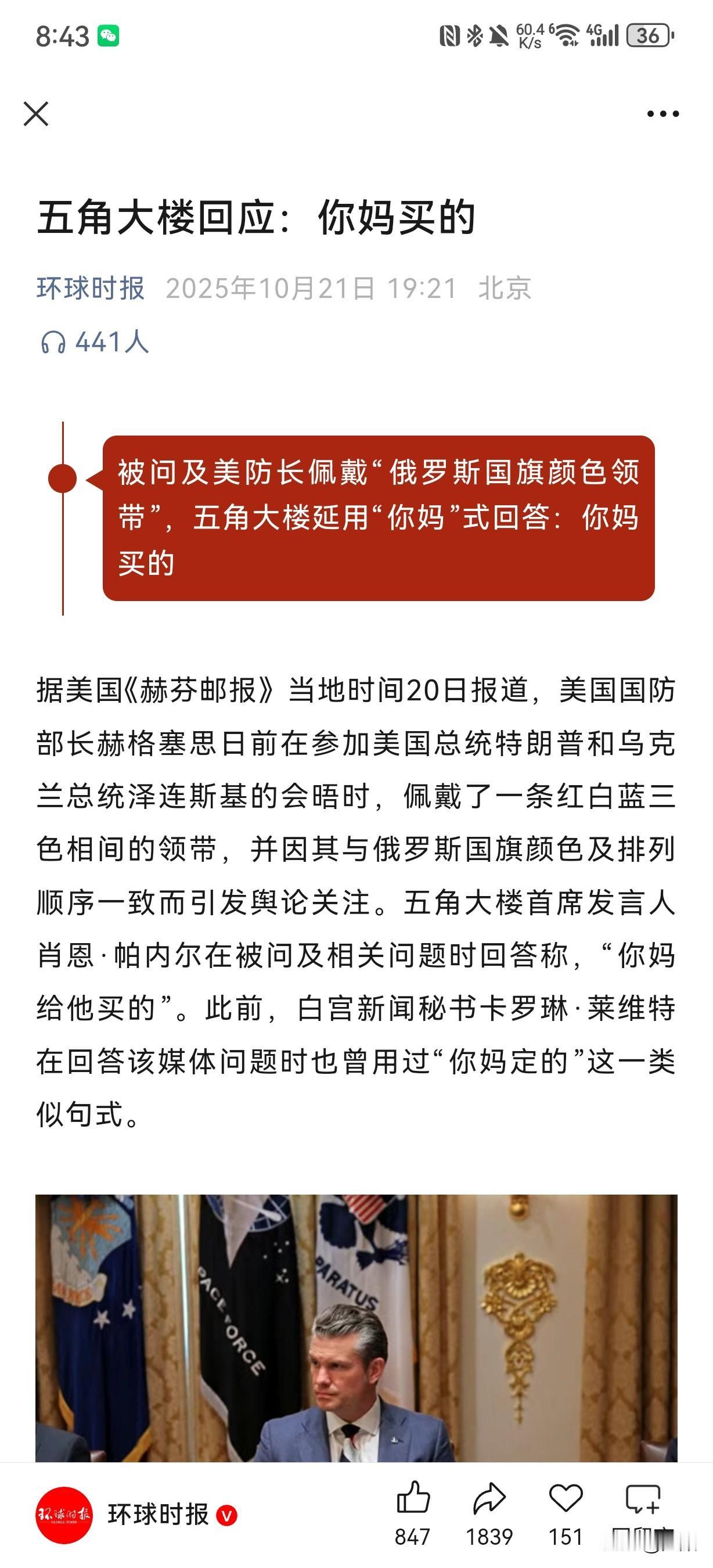 美国国防部回应再现神句:你妈定的!“你妈”已成为美国官方标准用语…… 当地时间10月20日,美国国防部长赫格塞思在特朗普与泽连斯基会晤中佩戴的红白蓝三色领带引发争议——其颜色排列与俄罗斯国旗一致,让外界猜测美俄关系动向。然而五角大楼首席发言人肖恩·帕内尔面对媒体求证,竟以“你妈给他买的”轻率回应。 此前白宫新闻秘书卡罗琳·莱维特在回应“布达佩斯会晤选址”提问时,也曾抛出“这是你妈决定的”的荒诞回复,甚至联合通讯主任嘲讽记者提问“虚伪无用”。作为美国政府核心发言人,本该以专业态度回应公众关切,却用“你妈”这类粗鄙话术回避敏感问题,实属罕见。