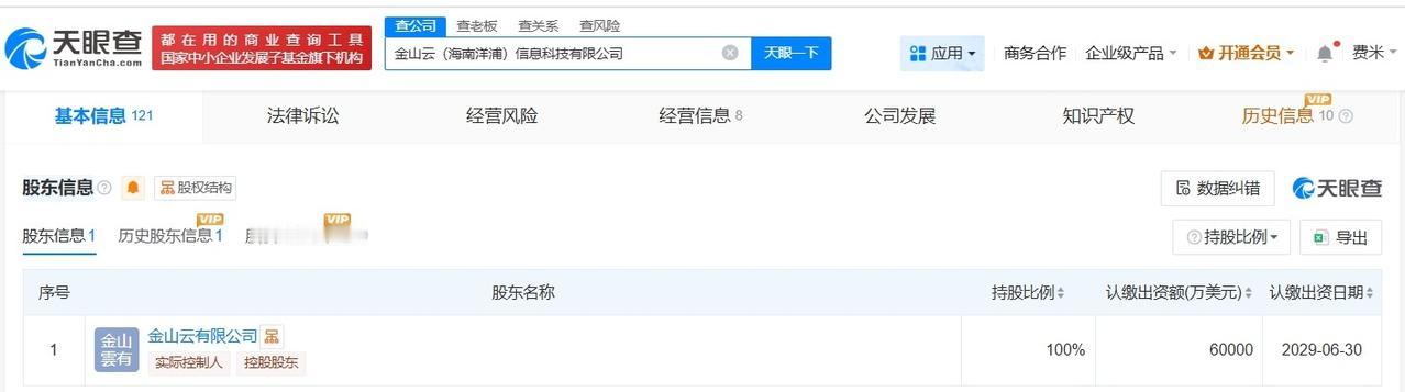 金山云旗下海南洋浦信息科技公司增资至6亿美元增幅20% 天眼查App显示,近日,