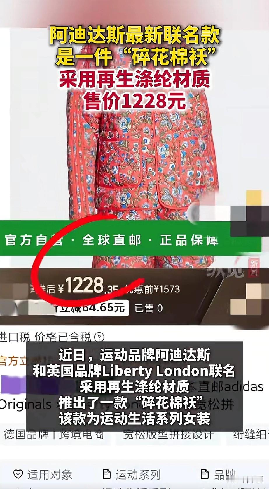 阿迪达斯和英国Liberty London联名出了套碎花夹棉外套加短裤套装。亮红色底印着蓝白碎花,还有老式绗缝工艺,看着特像奶奶压箱底的花棉袄。 这套是女装,用再生涤纶做的,日本直邮,只在天猫国际自营卖,领券后1228元,官方旗舰店没有。 网友吵翻了。有人调侃“农贸市场89不能更多”,还说“阿迪盯上奶奶退休金了”,脑补出穿它坐炕上嗑瓜子的画面。也有人说“不理解但尊重”这种时尚碰撞。 其实这是品牌在试复古风混搭运动感。但普通消费者看的是实在,1200多买件“奶奶风”套装,难免觉得不值。时尚和大众审美搭不搭,还得看大家认不认这个价。