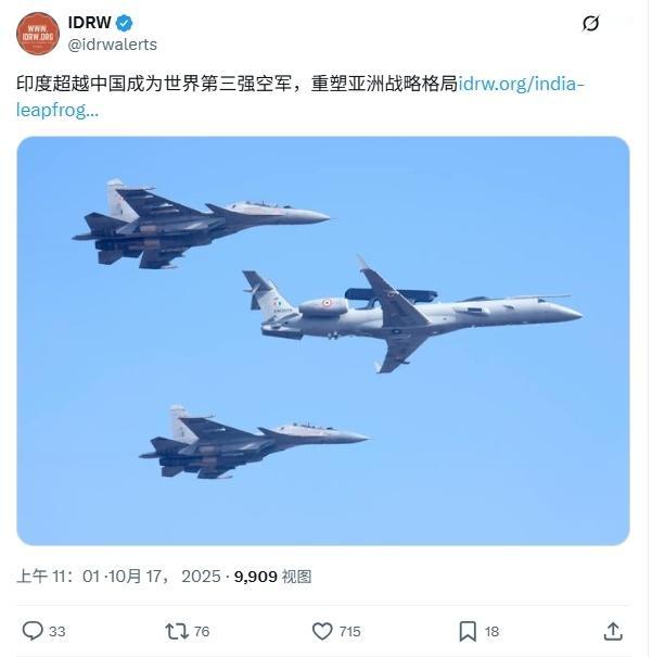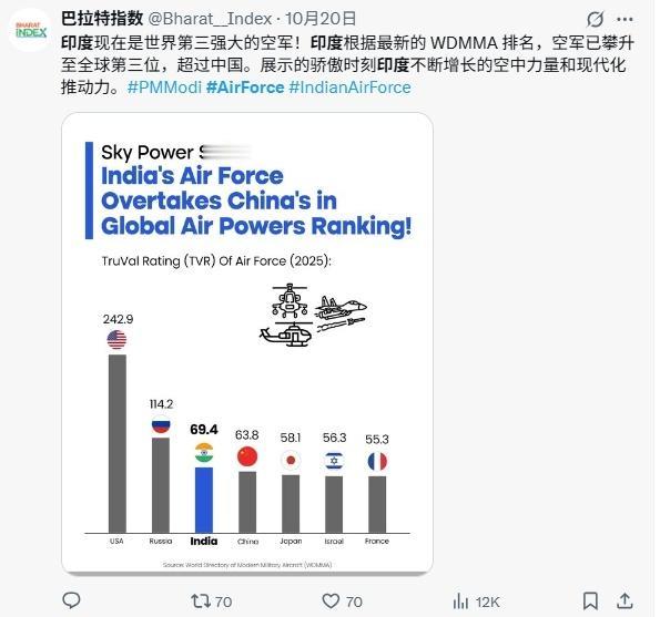 谎话说多了自己都相信,美国一家智库搞了份全球空军排行榜,把印度空军放在第三名,比中国空军还要高一档。搞得印度媒体开始狂欢,觉得排名一出印度空军战斗力立刻提升一个档次,他们真的以为自己空军可以排世界第三,甚至还包括印度人民党。 作为中等区域强国,印度空军规模挺大,但是主力完全以外购为主,包括美俄法英等多国不同机型。具体到俄罗斯苏-30MKI、米格-29,美国C17、P-8A,法国“阵风”、幻影,以及英法合研“美洲豹”等,自研LCA“光辉”性能太差上不了台面。就这样的配置,在上轮印巴冲突中被击落5架战机,其中就包括最强的“阵风”。从字面数据到实战检验,印度空军连巴基斯坦都比不过,还真以为自己可以位列全球第三名排在中国前面,说到底无非是美国想卖飞机给印度,先让他们开心一下。