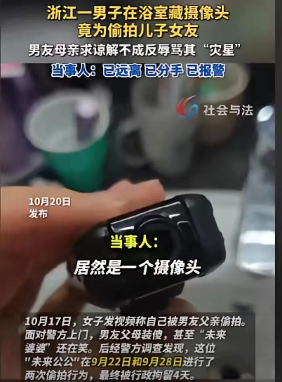 浙江一男子在浴室藏摄像头,目标竟是儿子的女友!更离谱的是,面对警方调查,男方父母装傻,“未来婆婆”甚至还在笑,最终男方父亲被行拘4天,女方果断分手报警。 这事儿的爆点不止是偷拍本身,更是一个家庭对“边界感”的完全漠视——把未来儿媳当成“监视对象”,用违法手段满足畸形控制欲,还企图用“家庭关系”模糊法律红线。当隐私被当成“家务事”随意践踏,这样的家庭底色,远比摄像头更让人脊背发凉。 您觉得,遭遇类似“家庭式侵犯”,受害者该强硬反击还是寻求调和?来聊聊,您会给身边人哪些“隐私保护必修课”?