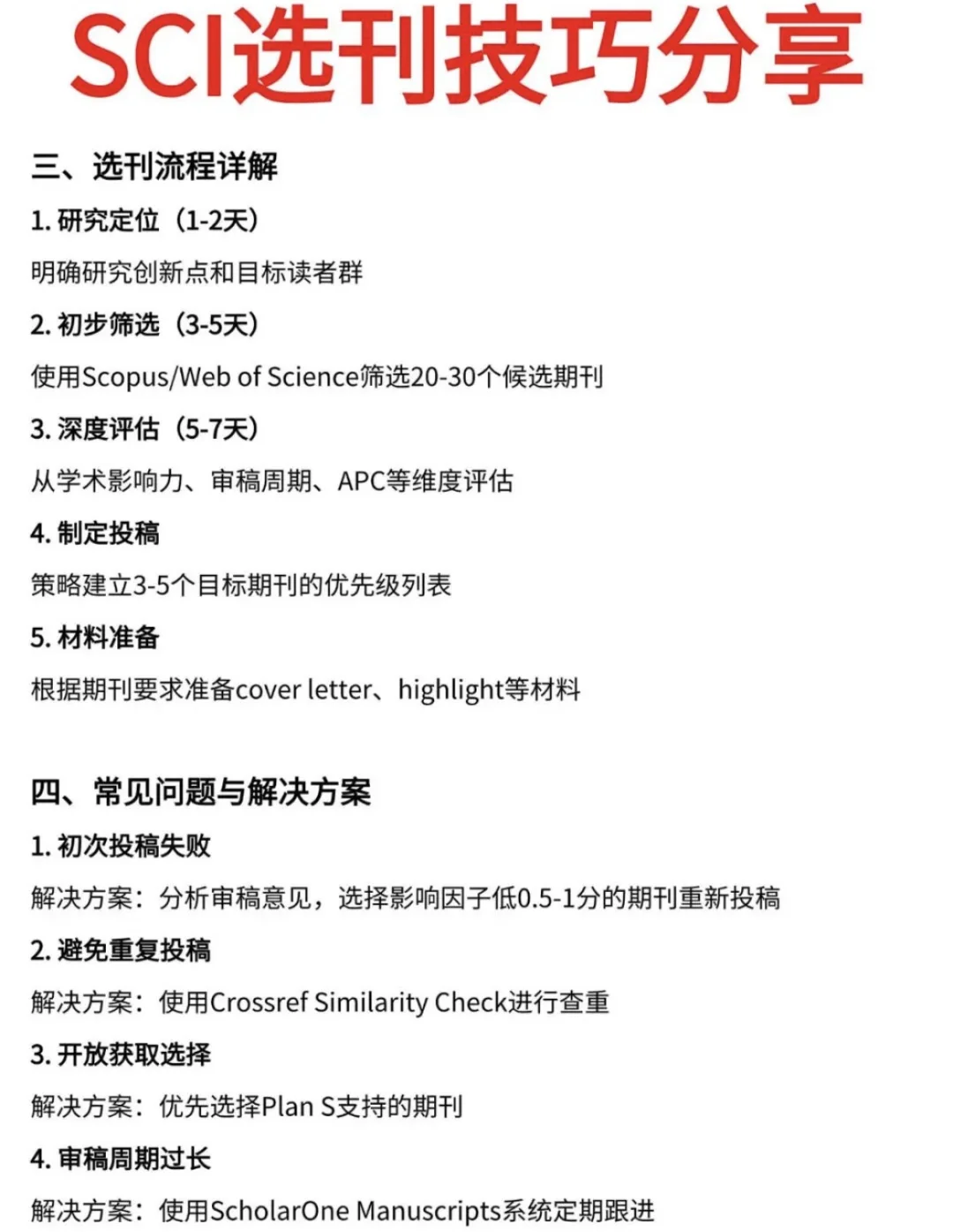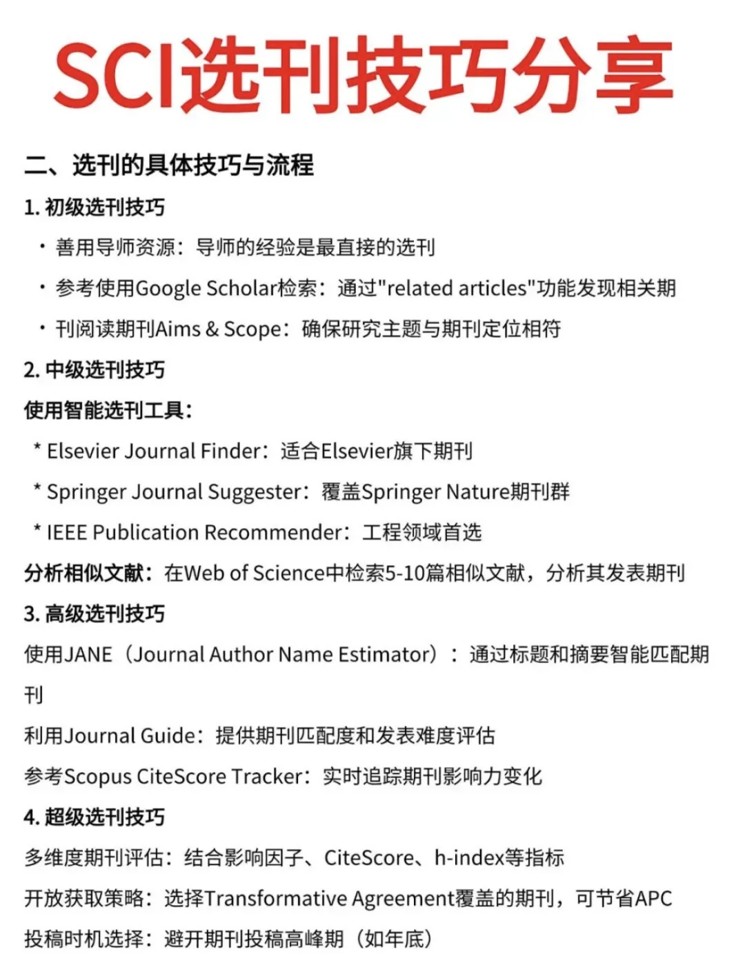 SCI选刊技巧分享 一、选刊的重要性与基本原则 1.研究领域与目标的精准定位 选刊的首要任务是明确研究领域和目标受众。以医学领域为例,中级职称评审通常要求发表在省级期刊,而正高职称则需发表在SCI期刊。建议使用Scopus或Web of Science数据库,通过学科分类精准定位目标期刊群。 2.论文质量与期刊匹配度的评估 论文质量是选刊的核心考量因素。建议使用Elsevier的Scival工具,通过文献计量学指标评估论文与期刊的匹配度。高创新性研究可瞄准Q1区期刊,而探索性研究则可考虑Q2-Q3区期刊。 3. 期刊声誉与影响力的权衡 影响因子并非唯一标准。建议结合CiteScore、SJR、SNIP等多个指标综合评估。例如,Nature Communications虽然影响因子较高,但其发文量大,录用率相对较高。 4. 审稿周期与费用的考量 使用Journal Review网站查询目标期刊的平均审稿周期。对于时间敏感的研究,可选择审稿周期在2-3个月的期刊。同时,要权衡APC(文章处理费)与期刊影响力。 5.避免盲目投稿 盲目投稿可能导致论文被拒,甚至浪费时间和资源。因此,选刊时需结合论文特点和期刊要求,避免“投石问路”的行为。