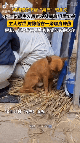 山西,一老人去世,小狗却在一旁独自伤神,它或许不懂“离世”的含义,但是它的心里面却知道主人再也没能从那扇门里出来!网友:万物皆有灵性,狗狗是最忠诚的伙伴。 信息来源:牛视频 这条棕褐色的小狗一动不动地趴在墙角,浑身像没了力气,眼眶湿漉漉的,眼角还挂着几撮眼屎,一看就是难受又迷茫。 它是老人捡来的流浪狗,从小被老人当孩子似的喂饭、陪它散步、晚上就让它窝在脚边睡觉,这感情早就刻进骨头里了。 可现在,门吱呀一声开,再也不会出现那张老人的脸了。 家属把这段画面传到网上后,很快就在牛视频(2025-10-19)上火了。 有的人就说了:“估计家里这几天人来人往太吵,狗狗没睡好,才会流眼泪、眼屎都出来了。” 也有人说:“别这么简单带过,我爷爷走后,他家那只猫整整三天不吃不喝,瘦得只剩骨头,守在爷爷常坐的椅子旁边,好几天都抬不起头。” 大多数人还是心疼这小家伙:“动物不会说话,可它们的感情比人专一,能明白离别的苦。” 其实,万物皆有灵,小狗是很忠诚的动物,它对主人是非常忠心,知道主人对他的恩惠,和人类一样是有感情的,只是它不会说话表达,而主人去世,它也会伤心。 这小狗用它那份静静的陪伴,默默的守护,让我们看到什么叫“爱与失去”。 所以,平时大家对待狗狗可以多一点善意,有时候动物的真心,纯粹而真诚,是非常可贵的。