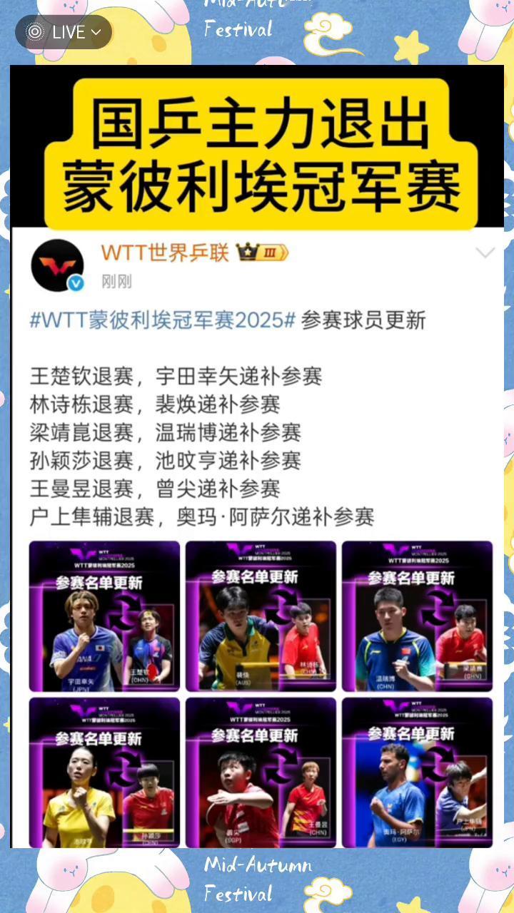 国兵主力退出蒙彼利埃冠军赛。 WTT官方最新公告:孙颖莎、王楚钦等国兵主力已退出