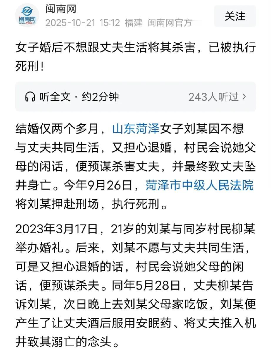 山东菏泽,21岁女子跟丈夫结婚2个月后,想离婚,又担心村里人说闲话,于是,她趁老公喝完酒后,哄他吃6片安眠药,然后将他骗到机井旁,让他下井捞鱼,丈夫在捞鱼过程中不慎坠入井内,4次向女子求救,女子做出喊人的假象,4次驱车往返,但并未去喊人。4个小时后,女子盖上井盖逃离现场,她丈夫因缺氧窒息致呼吸循环衰竭死亡。事后,女子被抓,法院判决亮了。 柳先生和刘女士是同一个村子的村民,刘女士的父母希望女儿嫁得近一些,相互也有个照应。 所以,在同村村民柳先生家人提出联姻的时候,他们很爽快应允了。 其实刘女士跟柳先生没感情,但在父母的劝说下,最终妥协。 2023年3月17日,刘女士和柳先生举行了隆重的婚礼,两人正式结婚住到一起。 刘女士以为,他们夫妻俩会像父母说的那样,日久生情,但事实并非如此。 刘先生觉得自己跟柳先生根本处不来,生活在一起对她来说是一种痛苦而非幸福,她一天都不想跟柳先生在一起了。 刘女士想到了离婚,可她又担心村里人说闲话议论她的父母,人言可畏。 为了摆脱柳先生,她绞尽脑汁,可思来想去,都找不到合适的方法,最终,她决定让柳先生彻底消失。 2023年5月28日,刘女士的父母打电话给柳先生让他们小两口回去吃饭。 当柳先生把这个消息告诉刘女士的时候,她觉得机会来了,于是偷偷上街买了6片复方地西泮片。 当天晚上,柳先生去岳父家,吃饭期间一高兴喝了不少酒,大概9点左右他们从刘女士娘家离开。 柳女士见柳先生喝得醉醺醺的,就哄他说,她手里有一些醒酒的药让柳先生服下。 柳先生吃完6片药后,刘女士又开车把他带到事先找好的机井旁。 刘女士跟柳先生说,最近她做了很不好的梦,听人家说,往井里抛硬币可以解梦,她让柳先生陪她来到井边。 柳先生信以为真,跟着刘女士来到井边,往里抛硬币。 抛完硬币后,刘女士为了让柳先生下井,她假装开心地对柳先生说,井里有一条很大的鱼,让柳先生下井去捞鱼。 为了哄刘女士开心,柳先生二话不说直接下井想要去捞鱼。 柳先生因为喝了酒的缘故,下井过程中扶不稳不慎坠入井内,冰凉的井水让他瞬间惊醒,他牢牢抓住井边缘,然后大喊着让刘女士去喊人来施救。 刘女士做出一副很担心的样子,开车假装离去,不久后,她返回,看到柳先生还在拼命挣扎。 柳先生看她回来,声音近乎哀求,让她赶紧去喊人,可刘女士不为所动。 柳先生在井里一共向刘女士呼救4次,但每一次她都假装离去后又返回。 折腾了4个小时,凌晨2点钟刘女士果断把井盖盖上逃离现场,之后柳先生因为缺氧窒息导致呼吸循环衰竭死亡。 不久后,在警方的努力下,刘女士被抓。 刘女士因犯故意杀人罪,菏泽中院一审判死刑,刘女士不服,提起上诉,之后山东高院维持原判,经最高法复核已被执行死刑。 那么,从法律角度如何看待这件事呢? 1. 《刑法》第14条规定,明知自己的行为会发生危害社会的结果,并且希望或者放任这种结果发生,因而构成犯罪的,是故意犯罪。 故意犯罪,应当负刑事责任。 本案中,刘女士因不愿离婚怕被议论,预谋让丈夫“消失”,事先购买安眠药、选定机井地点,哄骗丈夫服药并下井,其明知丈夫酒后服药后坠入井内会面临生命危险,仍4次假装呼救、最终盖井盖逃离。 主观上对丈夫死亡结果持放任甚至希望态度,完全符合故意犯罪的构成要件,具备明确的犯罪故意。 2. 《刑法》第232条规定,故意sha人的,处死刑、无期徒刑或者十年以上有期徒刑;情节较轻的,处三年以上十年以下有期徒刑。 故意sha人罪包括作为与不作为两种形式,行为人通过先行行为创设危险后负有救助义务,拒不救助致他人死亡的可构成不作为故意杀人 。 刘女士的行为兼具作为与不作为,作为层面,她主动实施喂药、骗至井边、诱骗下井等行为创设危险;不作为层面,在丈夫坠入井内呼救后,她有能力施救却拒不履行义务,最终导致丈夫缺氧死亡。 其犯罪动机卑劣、情节恶劣、后果严重,符合“罪行极其严重”的情形,法院据此判处死刑符合该法条规定。 3. 《刑法》第5条规定,刑罚的轻重,应当与犯罪分子所犯罪行和承担的刑事责任相适应。 本案中,刘女士为满足个人私欲,精心策划杀人行为,从准备药物到选择作案地点均有预谋。 刘女士在丈夫多次哀求时毫无悔意,持续4小时放任危险发展并最终盖井盖加速其死亡,犯罪情节极其恶劣,对家庭和社会造成了不良影响。 法院综合其犯罪动机、行为手段、危害后果等因素,判处死刑并经最高法复核执行,既体现了对故意sha人罪的严厉惩处,也符合刑罚与罪行相适应的基本原则,实现了法律效果与社会效果的统一。 关注@猫眼学法 品读案例故事,学习法律经验