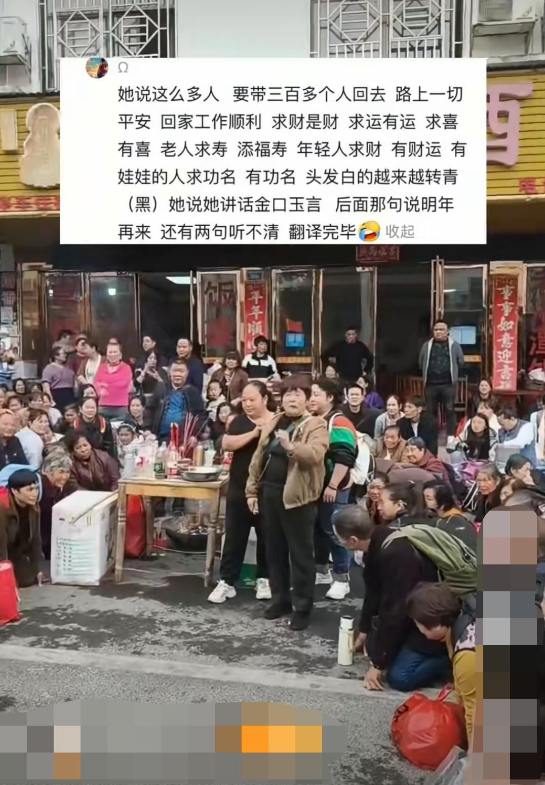 湖南衡阳。大姐带领300信众去南岳拜菩萨,这号召力比那些千万级别的大网红如何? 视频显示:这些信众都跪在地上,非常虔诚的听大姐不停的唠叨。有好事网友翻译大姐说的话,大概意思就是她讲的都是金口玉言,明年还会再来…… 我就纳了个闷了,破除迷信这个口号都喊了多少年了,这些人怎么还是执迷不悟呢?不知道这些人是在拜这个大姐还是在拜山上的菩萨?