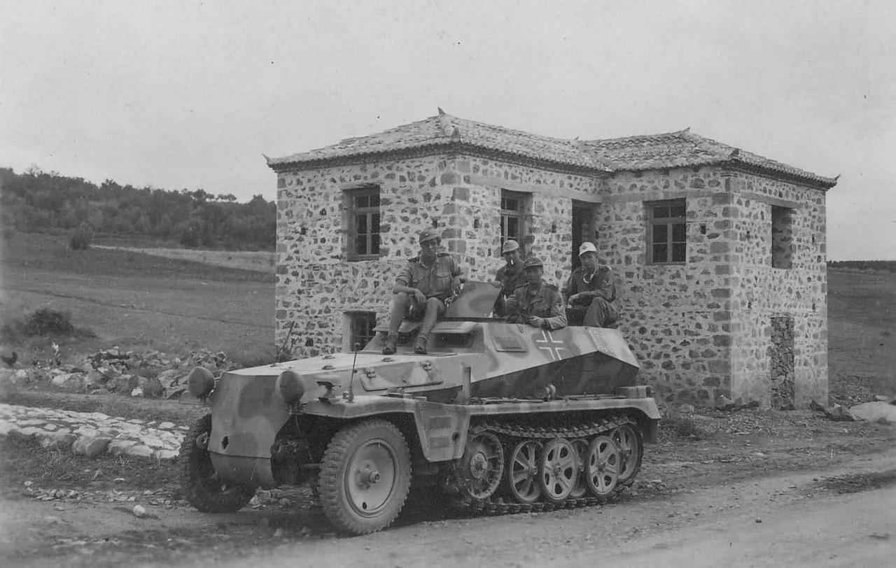 赶着去送死——1944年,党卫军第4警察装甲掷弹师的军官乘坐Sd.Kfz 250装甲运兵车向布达佩斯前线开进。此时苏军部队距布达佩斯仅数公里,至1944年12月26日该城将被完全合围。约五万名德匈联军最终陷入包围圈。 大家注意:照片右侧是党卫队旗队长赫尔穆特·德尔纳(Helmut Dörner),他于1945年2月11日在布达佩斯尝试突围时阵亡。 “党卫军第4警察装甲掷弹师”是德国武装党卫军序列中由原秩序警察组成的机械化步兵师。 “Sd.Kfz 250装甲运兵车”(参见图2)是二战德军标准轻型半履带装甲车,可搭载4-6名士兵,主要执行侦察和步兵输送任务。 “旗队长”是党卫军衔级,相当于陆军上校,通常担任团级指挥职务。