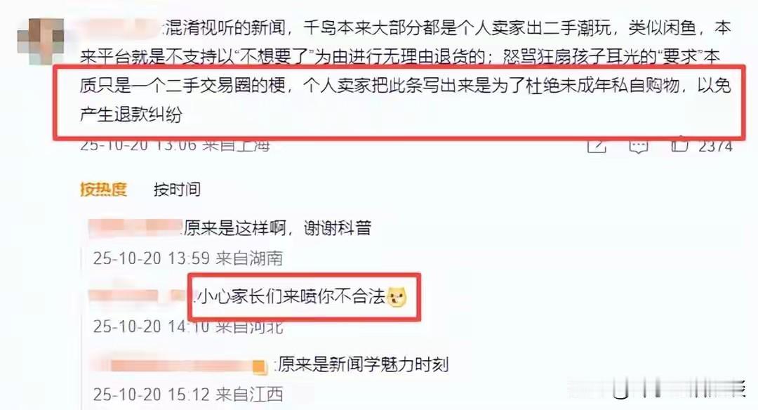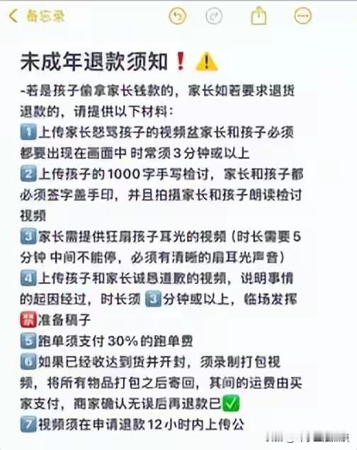退款竟逼家长扇娃5分钟!这卖家的要求,看完气得手发抖 11岁孩子趁大人不注意,拿外婆手机在千岛App花500多买了卡牌。妈妈发现后赶紧找卖家退款,结果对方的回复直接让人懵了——想退钱?先录个视频,得对着孩子狂扇5分钟耳光,中间还不能停,另外还得让孩子写1000字检讨,家长孩子一起签字按手印,再拍段3分钟的道歉视频。 妈妈没办法,找平台客服帮忙,可客服就说“管不了,你们自己协商”。这事传到网上,网友直接吵开了。有人觉得孩子没规矩该教训,也有人骂卖家这是明着教唆家暴,可没几个人提,这5分钟的耳光要是真扇下去,孩子心里得留下多大的阴影。 再一查,千岛App上相关投诉都快破万了,售后难根本不是新鲜事。说白了,这事里没一个占理的:孩子犯错得教,但不是这么教;卖家要维权,也不能拿孩子撒气;平台拿着用户的信任,遇事就甩锅。真要想不出现这种荒唐事,平台得先把责任扛起来,家长也得看好孩子的手机,别再让这种糟心事发生了。未成年网购退款 电商退款 退款规则