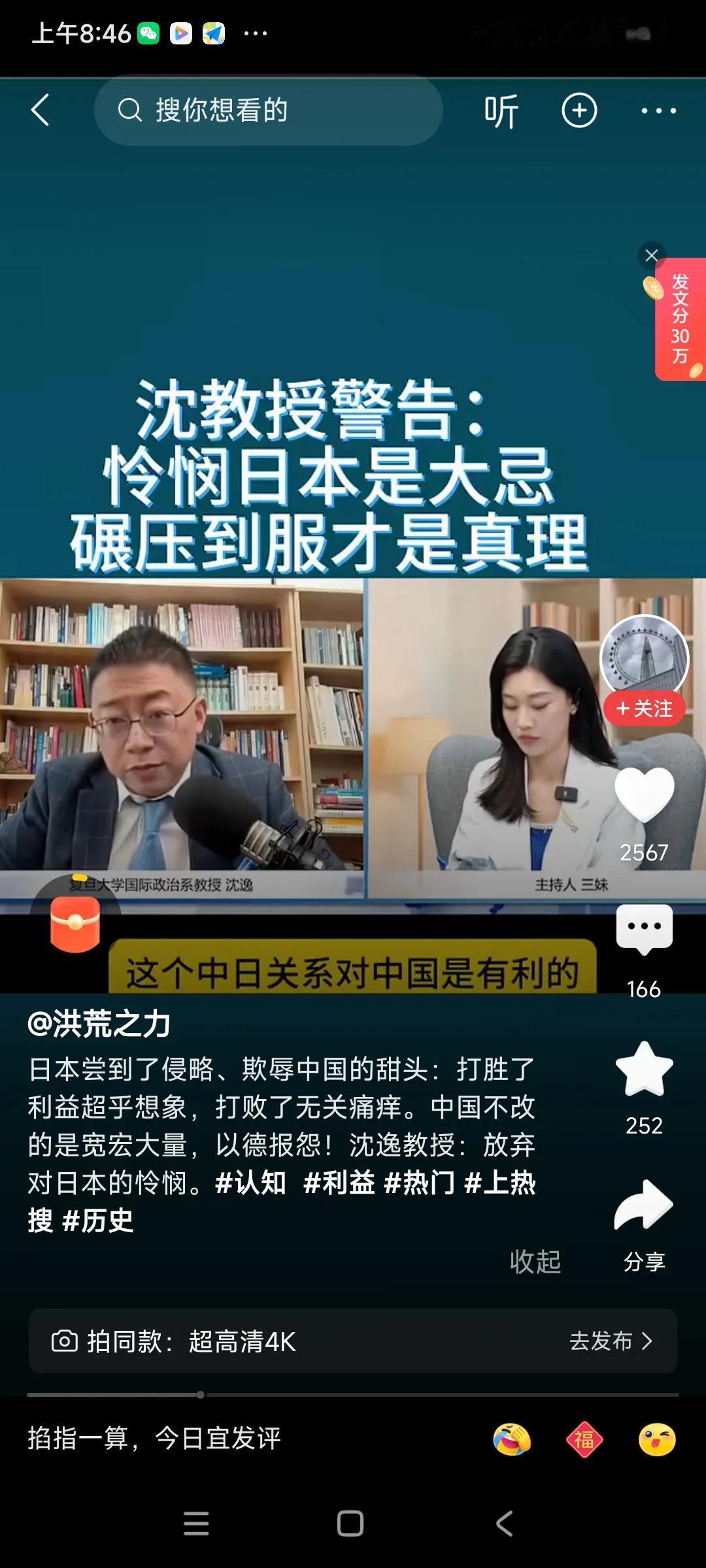 这二位学者说得好,对日本必须强硬,日本相当于三国时的吕布,凶神恶煞,又反复无常,连美国也吃尽了他的苦头,太平洋战争,美军拿出看家本领,付出十几万军人为生命,才战胜日本法西斯,,所以美国在日本驻军几万人,明着是防前苏联,其实是防止日本军国主义死灰复燃,,,[捂脸][捂脸] 沈逸教授说的好,日本是尝到了侵略中国的甜头,打胜了,获得利益超乎想象,既使打败了,也无关痛痒,他缩回岛内了,他知道我们宽宏大量,不像前苏联会残酷报复,不像美国会出动轰炸机对日本实施无差别轰炸,又扔下原子弹,美国,苏联,都是狠人,日本人心里有底的,[捂脸][捂脸] 所以,对日本,将来发生战争,一定要快,准,狠,,彻底打服他才有用,日本足球队在世界杯预选赛打中国,一场7:0,日本队毫不脚下留底,使了全力的,,咱们将来打日本也一样,使出全身力气去打!