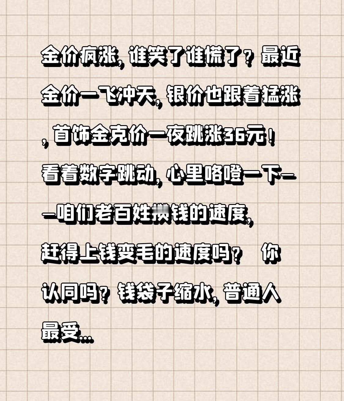 金价疯涨,谁笑了谁慌了? 最近金价一飞冲天,银价也跟着猛涨,首饰金克价一夜跳涨36元!看着数字跳动,心里咯噔一下——咱们老百姓攒钱的速度,赶得上钱变毛的速度吗? 你认同吗?钱袋子缩水,普通人最受伤啦。 同样的十万块,十年前能付个小户型首付,现在可能买个车位都悬。 黄金暴涨背后,是纸币购买力悄悄蒸发。普通人辛苦存钱,到头来发现攒了个寂寞;富人手握黄金资产,躺赚增值。贫富差距在这轮行情里被撕得更开了。 那你你来说说黄金为啥是“硬通货”? 自古乱世藏金。黄金稀缺稳定,全球认账,战争动荡时更显价值。 但问题来了:有钱人闲钱多,买金条等升值;普通人工资刚够开销,眼看金价起飞却摸不着边——用钱生钱,比用汗水攒钱快太多。 如今这场财富游戏,你怎么看? 有人说该跟风买金,有人说泡沫要破。但更值得思考的是:当劳动致富赶不上资产增值,社会公平的天平该如何摆正? 你身边有人因金价暴涨受益或焦虑吗?欢迎分享见闻。 发优质内容享分成 冬天