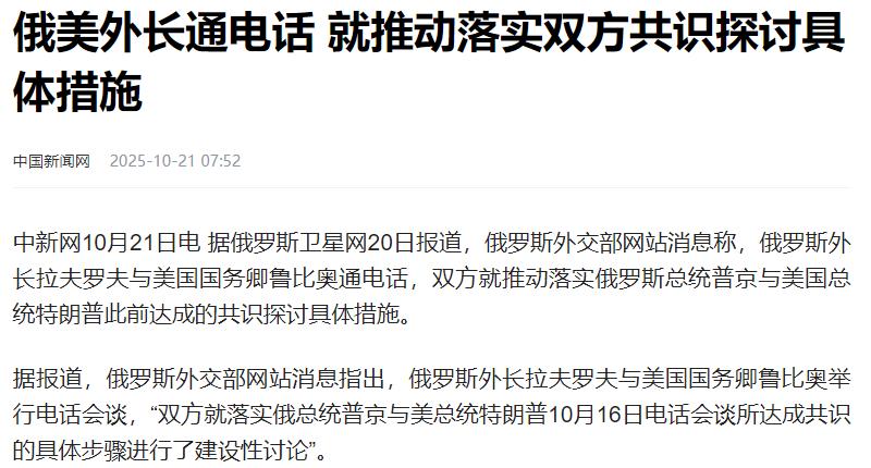 当地时间20日,俄罗斯发布通报,外长拉夫罗夫和美国国务卿鲁比奥举行了通话,双方围绕如何落实俄美领导人10月16日通话达成的共识,就可能采取的具体步骤进行了建设性的讨论。 单从这件事就能清楚看出,在俄乌冲突的关键问题上,美国已经不再把乌克兰的意见放在优先考虑的位置,甚至可以说,乌克兰的态度正在被边缘化。 从实际情况来看,乌克兰目前的抵抗能力几乎完全依赖美国和欧洲的支持。但欧洲的军工生产能力有限,还得供自己使用,像防空导弹、主战坦克、装甲车这些实打实的重型武器装备,绝大多数都是美国提供的。 这种高度依赖的关系,让美国在对乌政策上掌握了绝对的主导权。只要美国和俄罗斯把双方的利益划分清楚,乌克兰的真实需求很可能会被抛在一边。 毕竟美国手里握着援助的“开关”,完全可以通过调整援助的数量、种类和节奏,来迫使乌克兰接受美俄协商好的条件,乌克兰几乎没有讨价还价的底气。 乌克兰之前在国际上能有一定的话语权,很大程度上也是靠西方各国的支持“撑起来”的。但随着局势慢慢变化,美国的战略想法也在悄然转变,不再像以前那样只通过乌克兰来和俄罗斯周旋,而是开始更注重和俄罗斯进行直接沟通。 这种转变并不是突然发生的,而是美国基于自身全球利益反复权衡后的结果——当美国觉得直接和俄罗斯坐下来谈,更符合自己的战略布局和利益诉求时,乌克兰的那些诉求自然就会被放到次要的位置,话语权被削弱也就在所难免。 与此同时,欧洲国家的态度也在发生微妙变化。受能源危机和国内经济压力的影响,像德国、法国等一些原本对乌援助积极的国家,现在也开始显得力不从心,援助的积极性明显下降。 欧洲支持力度的减弱,进一步让乌克兰在国际谈判中的筹码变得更少。在这样的大环境下,泽连斯基政府想要维持住之前的话语权难度极大。 更关键的是,美俄这次通话聚焦的是落实两国领导人达成的共识,涉及到的具体步骤很可能直接关系到冲突未来的走向,比如战场停火、人道主义通道开辟等关键议题,但乌克兰却完全没能参与到这场对话中。 这种被排除在核心谈判之外的局面,正是泽连斯基话语权减弱最直接的体现。 当一个国家的命运在很大程度上要靠外部势力的协商来决定,而自身又没有足够的实力去主导谈判时,话语权的流失就成了必然结果。 现在乌克兰连参与讨论自身命运的资格都在被削弱,后续在涉及领土、安全、战后重建等更核心的问题上,又能有多少自主决定权呢?