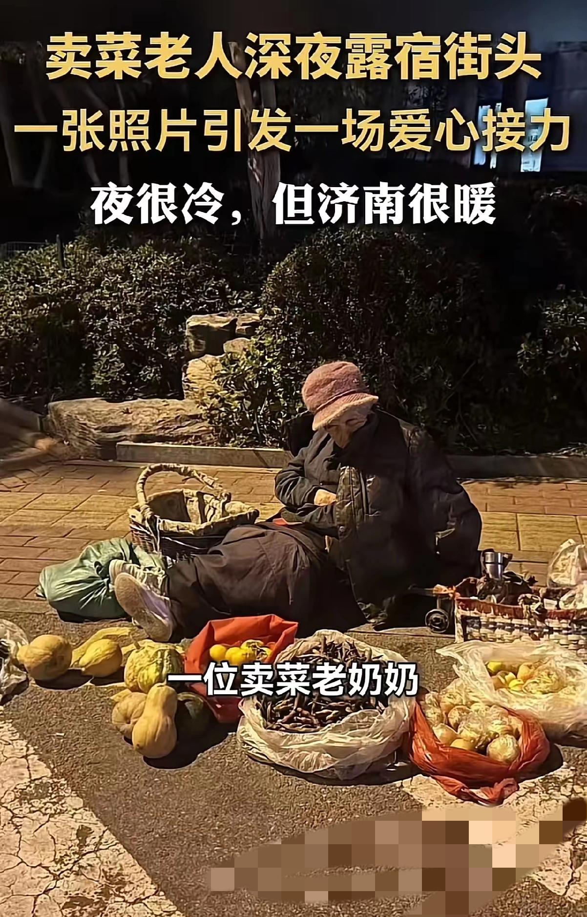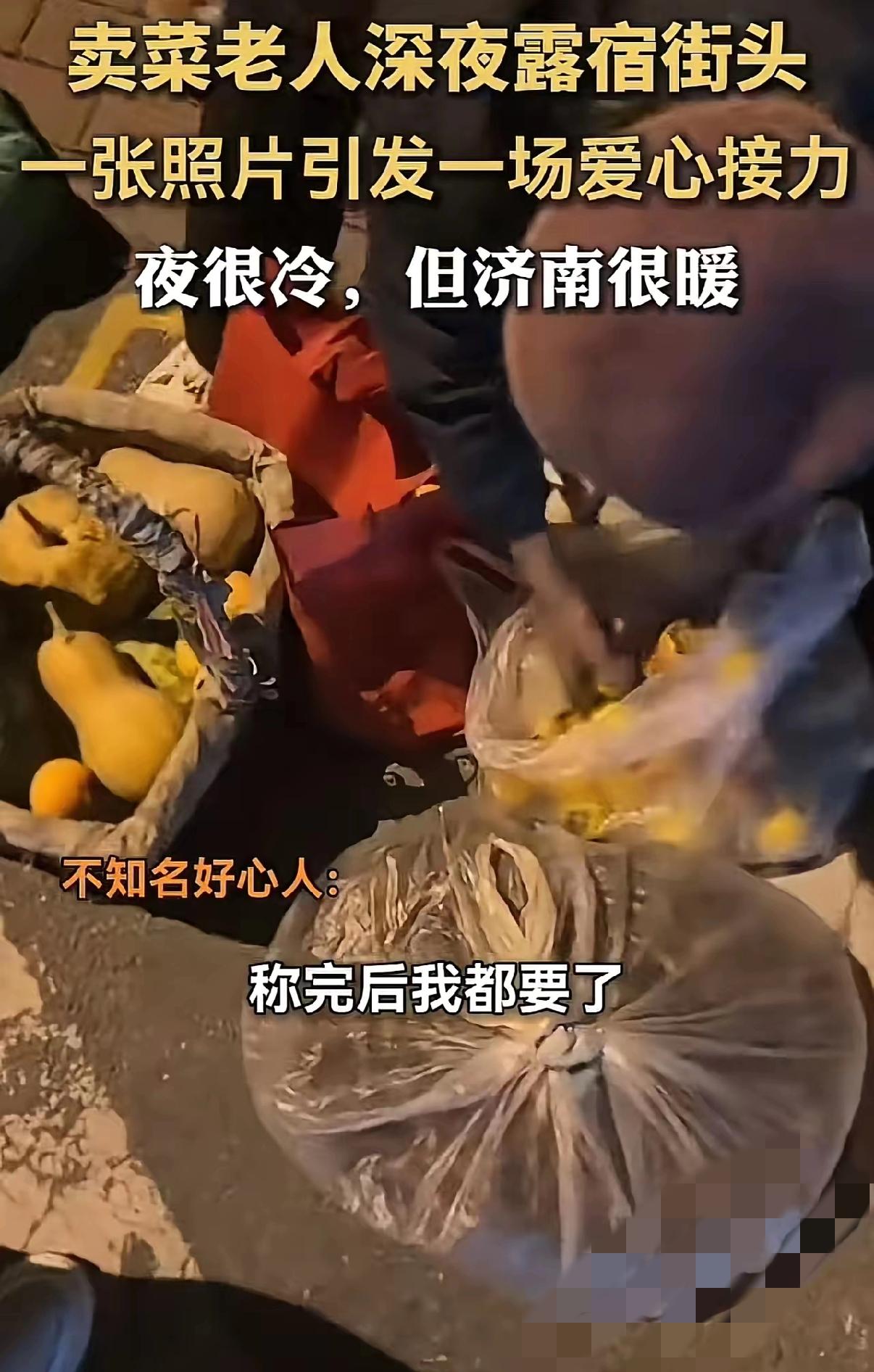 太让人暖到心了——深夜11点,卖菜老奶奶蹲在路边冻得缩成一团,就因为记错末班车,只能守着没卖完的菜熬到天亮,还好欧阳先生撞见发了朋友圈,竟直接掀起一场爱心接力! 有个打小被奶奶带大的好心人,看了照片立马赶过去,蹲在老人跟前说“你称,这些我全要了”,最后还开车把老人送回了家。评论里全是夸济南的,说这城市骨子里就透着善良,之前交警给急救病人带路,现在又有陌生人帮老人,一点不掺假。 其实济南的暖,从来不是装出来的,是有人看见别人难时,没想着“多一事不如少一事”,而是伸手搭了把。这比啥宣传都管用,一座城的温度,就是靠这些小举动堆出来的。 你们要是在路边碰到这样的老人,会愿意停下脚步搭把手吗?
