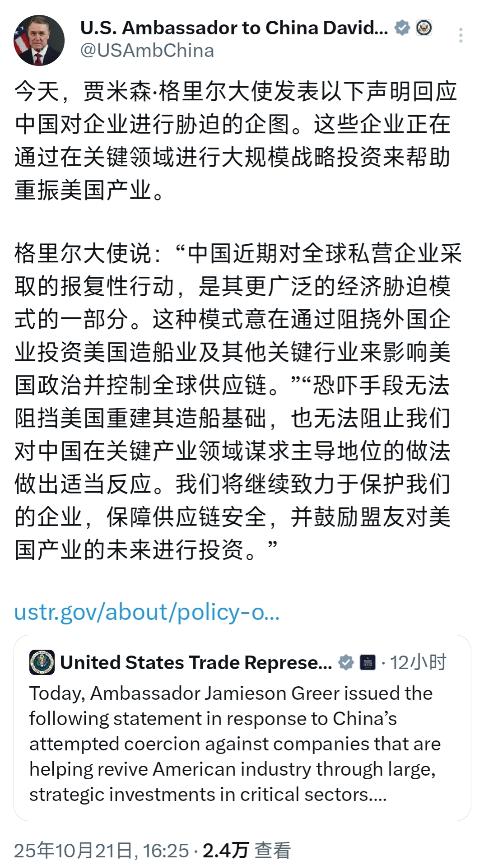 美国驻华大使庞德伟今天(10月21日)写道:“今天,贾米森·格里尔大使发表以下声明回应中国对企业进行胁迫的企图。这些企业正在通过在关键领域进行大规模战略投资来帮助重振美国产业。 这话听着挺吓人,其实就是美国老一套的“自己干坏事,反倒赖别人”。你看他说的“中国报复”,其实是10月14号咱们商务部对韩华海洋那5家美国子公司出手了,不让国内企业跟它们做生意。 但这真不是咱们没事找事,是美国先挑的头,之前就对中国海事、物流、造船业搞所谓的301调查,拿自己家的法律管咱们的事儿,还随便加关税。咱们这是按规矩反击,用他的办法怼回去,这咋就成“胁迫”了? 再说说美国吹的“重振造船业”,今年4月特朗普政府还大张旗鼓整个“造船办公室”,说要砸大钱把造船业搞起来。结果呢?才到7月,那办公室的负责人就走了,这部门基本算黄了。 更搞笑的是,美国造船业不行根本是自己作的,有个《琼斯法案》,非要国内海运都用美国造的船,结果造一艘船的成本比中韩贵4倍,干活还没人家四分之一快。现在倒好,把自己的问题赖到咱们头上,这就跟自己家房子漏雨,反倒怪邻居没帮着撑伞一样离谱。 美国还瞎嚷嚷“中国控制全球供应链”,可实际情况根本不是这样,中国一直是帮着稳住全球产业链的。就说今年上半年,咱们国内老百姓买东西就花了24.5万亿,线上买东西还涨了8.5%,政府搞的以旧换新也拉着大家多花了一万多亿。 就连那些西方奢侈品,像Burberry、COACH,都在唯品会上打2折卖,好多年轻人都抢着买。这花钱的劲儿,明明说明中国市场又开放又有活力,哪儿来的“控制”啊? 还有他说的“拉盟友投资”,最近美国跟英国签了个《科技繁荣协议》,说要投420亿美元帮英国搞AI。可英国媒体都看明白了,这些钱好多本来就是美国企业计划在全球投的,就是借个协议装装样子。 反观咱们,今年上半年跟东盟做买卖就做了3.5万亿,中老铁路通了之后,老挝的农产品能卖出来的量都多了120%。这才是真真切切的互相帮忙,大家都能赚到钱。 咱们外交部早说了,“美国拿签证吓唬人,吓不住明白事儿的人,也拦不住中国和其他国家好好合作”。这话放这儿也一样,美国说“经济胁迫”根本吓不着咱们。咱们有《反外国制裁法》撑着,工业体系也全乎,还有14亿人这么大的市场。商务部也说了,“咱们反击的办法多着呢,都能按规矩来”。 说到底,美国这么瞎指控,其实就是怕了,怕中国在5G、新能源、造船这些领域追上他,怕更多国家跟中国合作。可他不想着怎么把自己的实力提上去,反倒用政治手段打压人。这既不合市场经济的规矩,还把全球产业链给搅乱了。中国政法大学的史晓丽教授说得特别对:“美国把关税当武器用,搞霸凌那套,最后只会让人笑。” 现在全球都是连在一起的,互相帮忙赚钱才是正道。咱们欢迎外国企业来中国投资,但绝对不接受用政治手段瞎折腾。美国要是真想解决问题,就别端着架子,坐下来好好谈,互相尊重。总不能一有事就拿制裁吓唬人,这招从来就不管用。