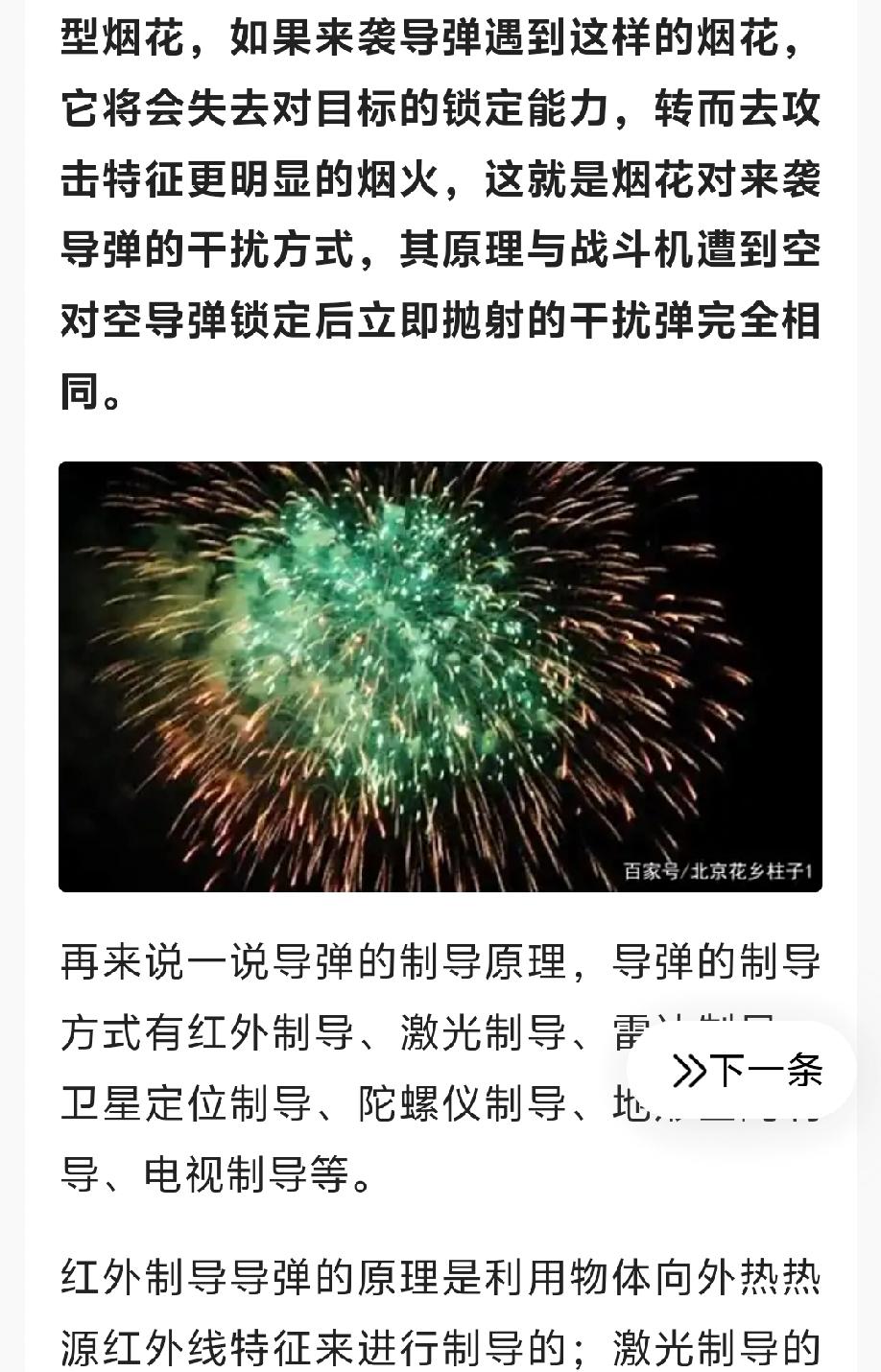 突然想到一个问题,禁止燃放烟花爆竹会不会是有战略意义,尤其是那些色彩绚丽的大礼炮,如果全国各地一起放,那阵势估计连雷达都能影响。 没想到我搜了一下燃放烟花的影响,发现还真的不是胡思乱想,大面积燃放礼花,会对目前大部分导弹的制导系统产生影响,而且飞机上的干扰弹就是受烟花的启发发明出来,军舰释放的干扰隐身弹幕也是一个巨大的烟花。所以或许禁止燃放烟花爆竹,真的是有重要的战略意义,以前不理解,现在明白了。禁爆竹 禁放花炮