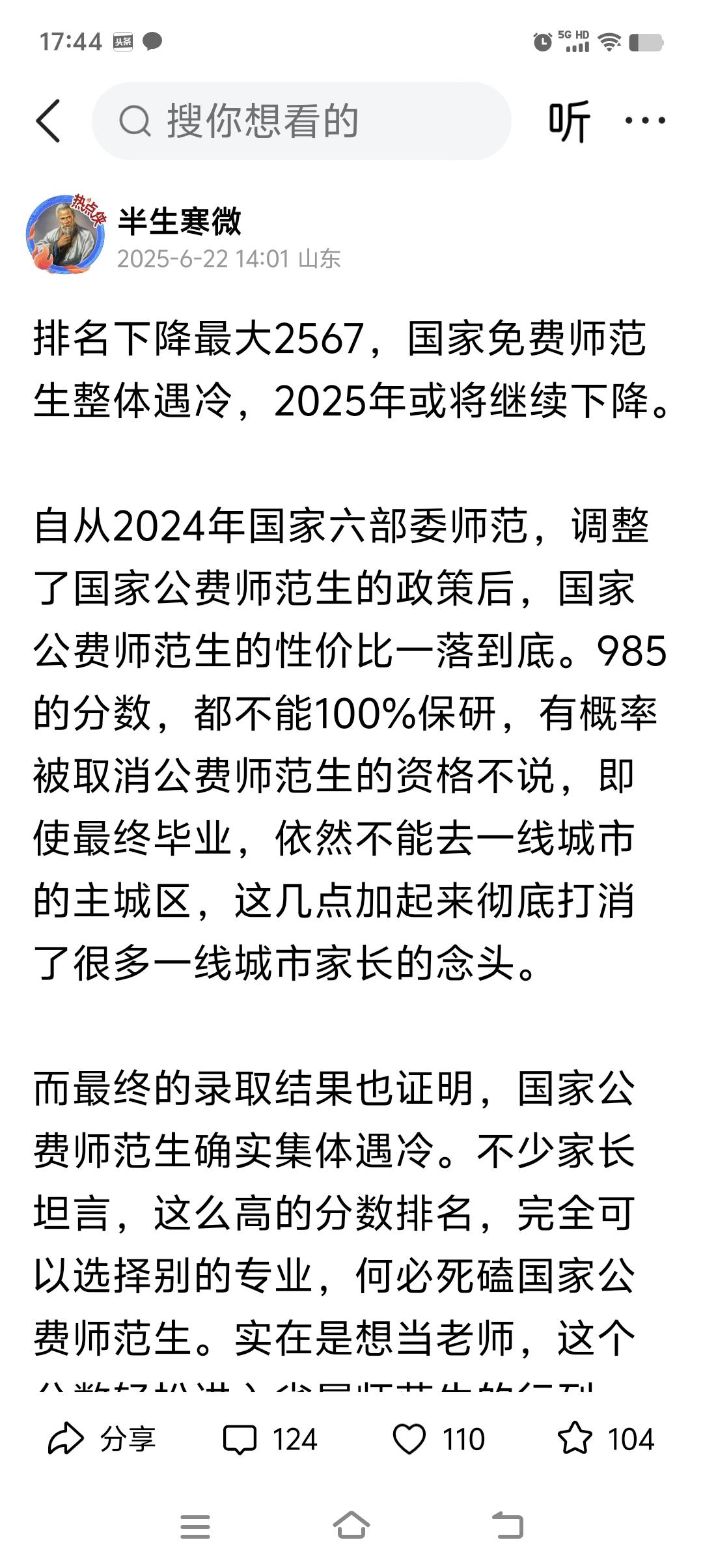 怎么样,被我说中了吧?2025国家公费师范生的录取分数线,已经被山东省属公费师范生的分数完全超越了。 我在今年6月22号发过一篇文章,预估了今年国家公费师范生有可能遇冷,分数继续降低的趋势。当时很多人还在评论区留言,说什么考不上酸这样的话。 如今分数线出来了,能上山东公费师范生的人,很多都能去国家公费师范生。但为什么偏偏不报国家公费师范生,而报省属公费师范生呢? 问题很简单,因为国家公费师范生的政策改变了,从原来的四年本科毕业改成了4+2本硕连读的模式,最关键的是想要读硕士需要达到推免的标准,达不到的取消公费师范生的资格!这也就意味着考上去只是一个门槛,最终能不能当老师还是未知数。而且推免保研不是百分百,绝对一定有人会被筛选下来。本来报这个公费师范生就为了一个稳妥,这倒好,一下子变成了有很大风险的事,但凡聪明的人就不会再考虑了。 再加上即使毕业后不能去主城区,以山东为例,济南和青岛的主要城区是不允许进入的,这就彻底断了一些想要靠国家公费师范生进入大城市的梦,录取分数线越来越低这是必然的。 而且这种情况会越来越明显,等四年后那些没有获得推免资格被筛选下来的人扼腕叹息的时候,国家公费师范生的生源会是一个很大的问题。以损失211甚至985的分数,去博一个教师的编制,这样的代价真的太大了,完全没有性价比。