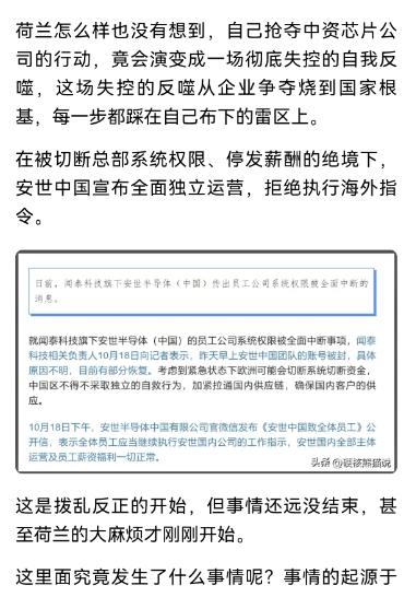 当初乌克兰将我们收购的马达西奇公司收归国有,我们居然没有采取任何有力反制,这也间接鼓励了一些西方列强对中资虎视眈眈,存觊觎之心,荷兰只是第二个尝试抢劫者,如果这次再不将他打痛冶服,杀鸡儆猴,那么中国在海外几万亿的资产将血本无归。 乌克兰对马达西奇的那波操作,算是给后来者开了个不怎么光彩的头,2015年那会儿,马达西奇因为丢了俄罗斯订单濒临破产,乌克兰政府自己都把它从战略企业名单里划掉了,等于摆着货架等着人来救。 中国的天骄航空瞅准机会出手,不仅砸钱稳住生产线、补发员工工资,2018年还补了协议,无偿给乌克兰让了25%股份,额外捐1亿美元支持当地航空业,承诺五年内不缩减投资和营收,简直是把合作的诚意拉满了。 可这份诚意没换来对等的尊重,美国一施压,说涉及“国家安全”,乌克兰安全局先冻结库存搞调查,2019年干脆一纸命令把马达西奇100%股份收归国有,直接没收了中方的全部权益。 中企气不过,先去斯德哥尔摩仲裁索赔35亿美元,后来又去海牙把金额提到45亿美元,折合人民币快320亿了,可官司打了好几年,钱没要回来,2025年俄军的轰炸还把厂子彻底毁了,连点念想都没留下。 从头到尾,咱们除了走法律程序维权,没看到什么能让乌克兰疼的反制措施,这事儿传出去,难免让某些心思活络的国家觉得“抢中资成本很低”。 果不其然,荷兰很快就接了茬,上演了一出更直白的“明抢”,2025年9月底,荷兰经济部突然用70年没动过的《物资供应法》下了部长令,把安世全球30个分支机构的资产、知识产权全冻结了,还纵容荷兰籍高管告自己公司,法院连听证会都不开就下禁令,把闻泰创始人的职务撤了,100%股份拆成99%托管、1%留空,让中企成了名义上的股东。 这哪是什么“供应链安全”,分明是看到企业赚钱了就想摘桃子,背后美国四个月前就定了调:要豁免安世就得换掉中国管理层,荷兰不过是按剧本演戏。 有了乌克兰和荷兰的先例,其他国家也跟着有样学样,智利去年就逼着天齐锂业参股的SQM跟国企搞合资,2031年起把管理权交出去,政府拿走70%到85%的利润。 要知道天齐2018年花了295亿才买了SQM23.77%的股份,为了通过审批还签了协议,不能提名自家董事、不能要商业敏感信息,本来就只是个财务投资者,现在连分红都要被大幅缩水。 更早之前2020年,巴新政府直接拒绝波格拉金矿的采矿证延期,把紫金矿业2.98亿美元投资的项目收了回去,虽说紫金收回了成本,但这种说翻脸就翻脸的操作,本质上也是对中资权益的无视。 这些事凑在一起,就像推倒了多米诺骨牌,背后都是看到了可乘之机,乌克兰抢马达西奇时,算准了咱们会优先走法律途径,不会立刻动真格;荷兰敢下手安世,是觉得能靠着美国撑腰,还能借欧盟半导体联盟的名义补自己的产业短板,完全没掂量掂量后果。 他们都忘了,中国2024年末对外直接投资资产就有31329亿美元,这几万亿的盘子里,藏着多少企业的真金白银和心血,要是都这么被抢下去,损失可不是小数目。 更有意思的是这些国家的双重标准,荷兰一边让ASML每年从中国赚几十亿欧元,离不开中国的稀土,一边转头就抢中资控股的企业;美国天天喊“私有财产神圣不可侵犯”,却带头把3000多项物项列入出口管制,还施压盟友打压中企,简直是把规则当抹布用。 之前南京海事法院有个反制裁诉讼的案子,中企被美国列入清单后,欧洲公司拒付1186万美元尾款,咱们法院扣了船逼着对方调解,最后拿回了8600多万人民币,这说明只要敢出手,维权是能成的。 这次对荷兰的反制就很及时,禁了安世中国基地的出口,掐住它全球80%的产能,欧洲车企立马芯片短缺减产;再收紧稀土管制,ASML的光刻机生产线都要停摆,荷兰那边很快就慌了,安世主动求着沟通要豁免,这才是打痛了的效果。 要是当初乌克兰收归马达西奇时就有这样的反制力度,荷兰未必敢这么明目张胆,国际社会本就是看实力说话,你越是退让,别人越觉得你好欺负。 中国的海外资产不是谁都能啃的肥肉,3万多亿美元的直接投资背后,是产业链的话语权和关键资源的控制力,比如全球90%以上的重稀土精炼技术攥在咱们手里,欧洲的汽车、半导体产业根本离不开。 现在荷兰的例子已经摆出来了,抢中企的后果就是自己产业链受损、企业营收下滑,这种亏谁都不想吃。 说到底,对付这种“抢东西”的行为,光靠打官司不够,得让他们知道疼。 乌克兰那笔45亿美元的账还没算清,荷兰已经先尝到了稀土和出口禁令的滋味,这要是能形成震慑,其他想跟风的国家就得好好掂量掂量。 毕竟谁也不会跟钱过不去,真把中国惹急了,断了他们的关键供应链,最后亏的还是自己。 这几万亿的海外资产,得靠硬气的反制措施守着,不然真成了别人眼里的“唐僧肉”,那才是真的亏大了。