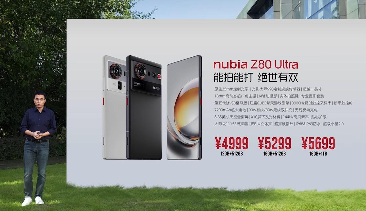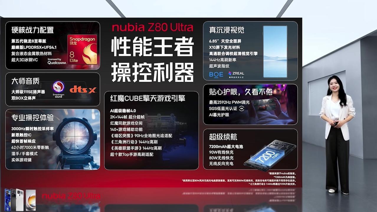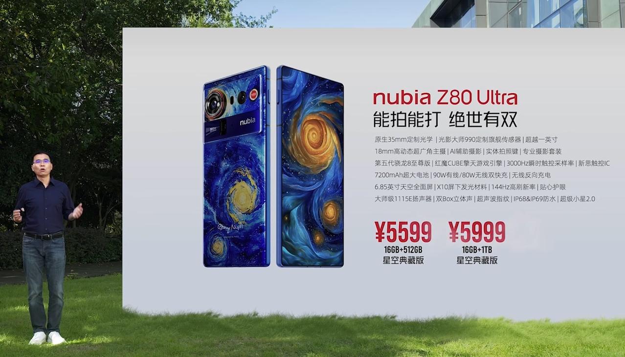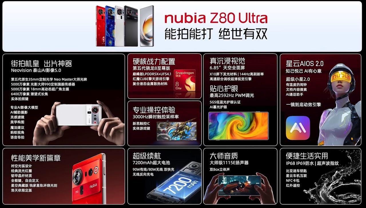 努比亚Z80 Ultra发布了!支持国补 1)6.85英寸1.5K分辨率+144Hz屏幕,BOE X10发光材料 2)2K + 144Hz超分超帧,2592Hz高频PWM高频调光 3)7200mAh电池+90W有线+80W无线充电 4)50Mp 35mm 1/1.3"定制大底主摄(光影大师990) 5)50Mp 18mm 1/1.55"大底超广角(OV50E) 6)64Mp85mm潜望长焦镜头(OV64B) 7)第五代骁龙8至尊版+红魔性能引擎 8)1115E扬声器,3D超声波指纹,IP68+69防水,USB 3.2 12+512GB售价4999元 16+512GB售价5299元;星云典藏版5599元;洛天依限定版5799元 16+1TB售价5699元;星云典藏版5999元