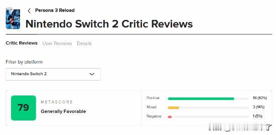 Atlus开发的JRPG游戏《女神异闻录3:Reload》的NS2版媒体评测已经正式公开。 截止目前,本作NS2版本的均分为79分,共收录22篇媒体评测,18家媒体给出好评,3家媒体给出中评,1家媒体给出差评。