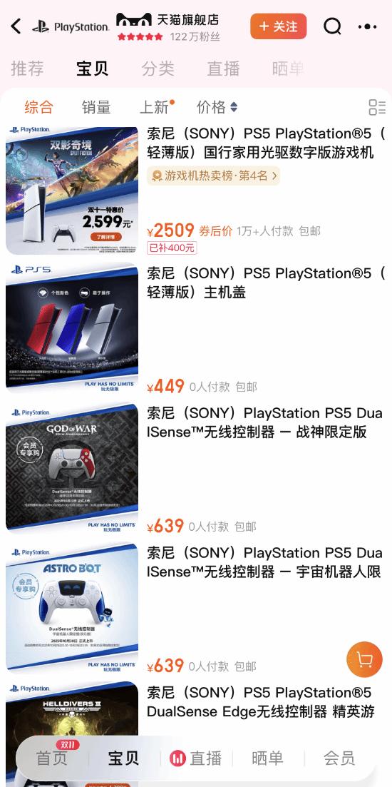 PlayStation中国直播分享会上,索尼宣布双十一促销即将开启,《战神》《宇宙机器人》限定手柄预售已上线。 PlayStation双十一大促活动于今日正式开始,10月21日晚20:30至11月11日晚23:59:59促销活动期间:PS5 Pro享活动优惠价5,099元;PS5主机标准版(轻薄版)活动优惠价3,199元,PS5主机数字版(轻薄版)活动优惠价2,599元,DualSense无线控制器活动优惠价499元(限定版除外),更有多款配件产品及经典游戏参与活动。