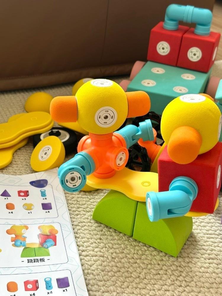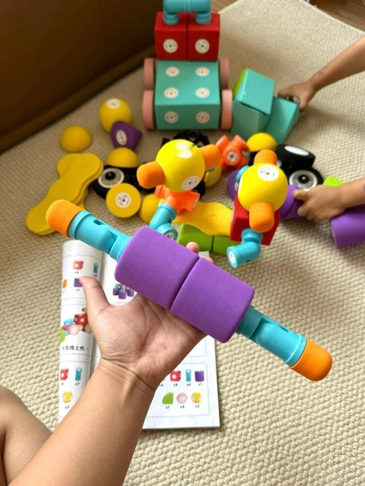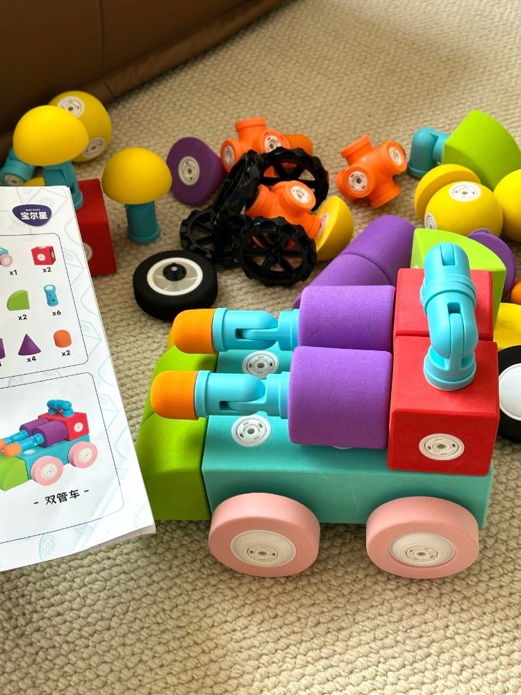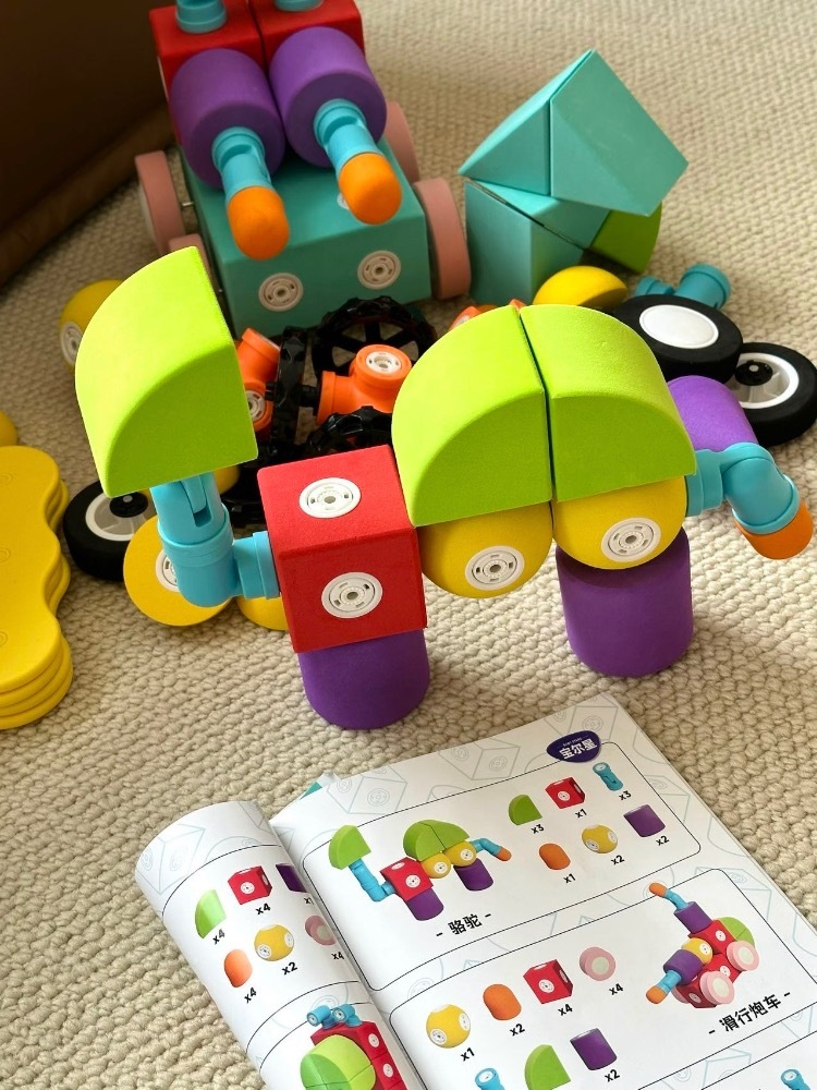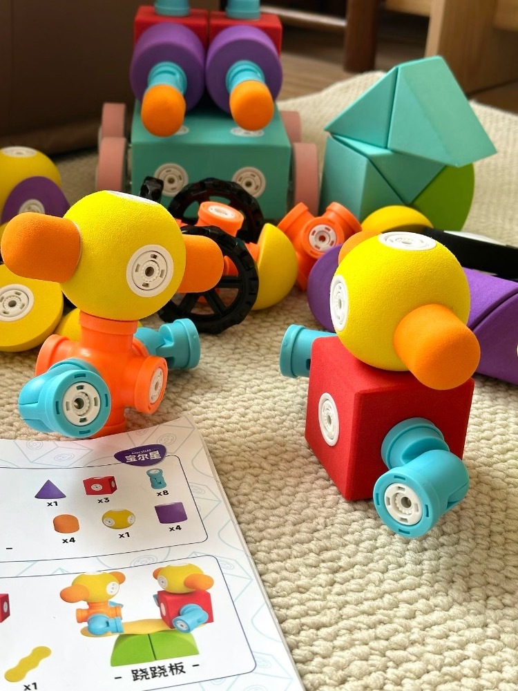 每颗积木都很大,防止误吞,还可以啃咬,超适合小宝宝玩,EVA磨砂材质,软软的,手感很好,而且磁力很强!宝宝自己就可以搭建了!儿童玩具