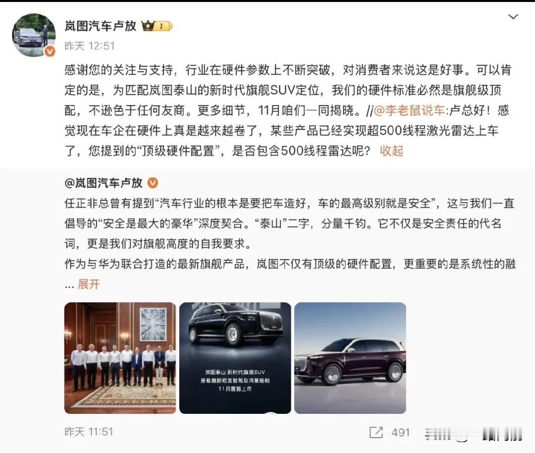 不可能,绝对不可能,庶子永远都是庶子 哪次不是“亲儿子”先吃红利?网传岚图泰山要首发华为超500线激光雷达,一堆网友直接炸锅:“绝对不可能!庶子哪能抢亲儿子的待遇?”这质疑可不是空穴来风,细扒逻辑真的太戳行业门道了。 懂华为车圈玩法的都知道,鸿蒙智行的“X界”家族才是妥妥的“亲儿子”,问界、尊界这些车型,从产品定义到销售渠道全是华为说了算,相当于“华为造的车换个壳”。而岚图这种走HI Plus模式的,顶多算“深度合作的好兄弟”,车企主导生产,华为卖技术,论亲近程度根本不在一个梯队。 更关键的是产品定位全撞车了。岚图泰山定位高端豪华SUV,车身尺寸5230mm、轴距3120mm,和问界M9的5230×1999×1800mm尺寸几乎重合,都是瞄准45万以上市场的旗舰车型。尊界S800更狠,直接卖到70-101万的超豪华区间,是鸿蒙智行的“门面担当”。现在说500线激光雷达先给岚图用,相当于让“亲儿子”问界、尊界用老款192线雷达,这不是逼着自家高端车丢面子吗? 网友的吐槽戳中要害:“华为疯了才会干这事儿!”要知道500线雷达的点云密度是老款的数倍,能精准识别远距离弱光目标,是L3+智驾的核心硬件。这种压箱底的技术,历来都是先给鸿蒙智行撑场面,当初ADS 4.0先装问界M9,鸿蒙座舱5.0先给智界S7,哪次不是“亲儿子”先吃红利? 更不合理的是技术优先级。有爆料说岚图泰山的智驾版本居然比尊界S800还高,这完全不符合商业逻辑。尊界作为华为的超豪华旗舰,本来就靠“技术顶配”撑溢价,要是连核心雷达都落后于合作车型,消费者凭啥花百万买单? 其实大家纠结的根本不是岚图能不能用华为技术,而是“首发权”的象征意义。这就像手机新品的芯片首发,从来都是自家旗舰先上,哪有把最新芯片先给合作品牌的道理?要是真让岚图抢了先,鸿蒙智行的“技术领跑”人设不就崩了?
