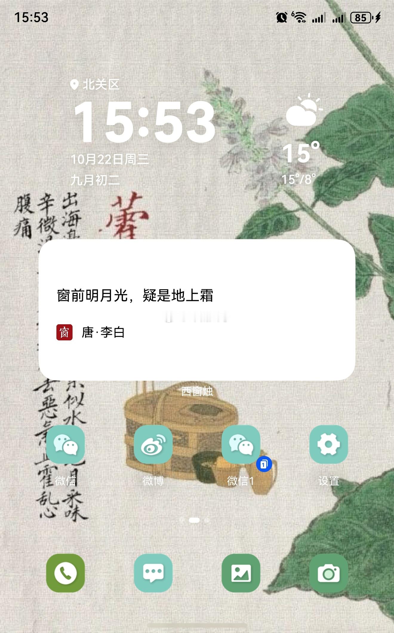 鸿蒙操作系统6正式发布更新了最新鸿蒙6 系统,大多数新功能还没体验,直观感受确实更丝滑了,打开各个App响应速度明显快了,试了下“小艺看世界”,其他功能以后在使用中慢慢了解吧。有一点很有趣,我每次更新系统,小卡片上的每日诗词都是这首《静夜思》[偷笑]