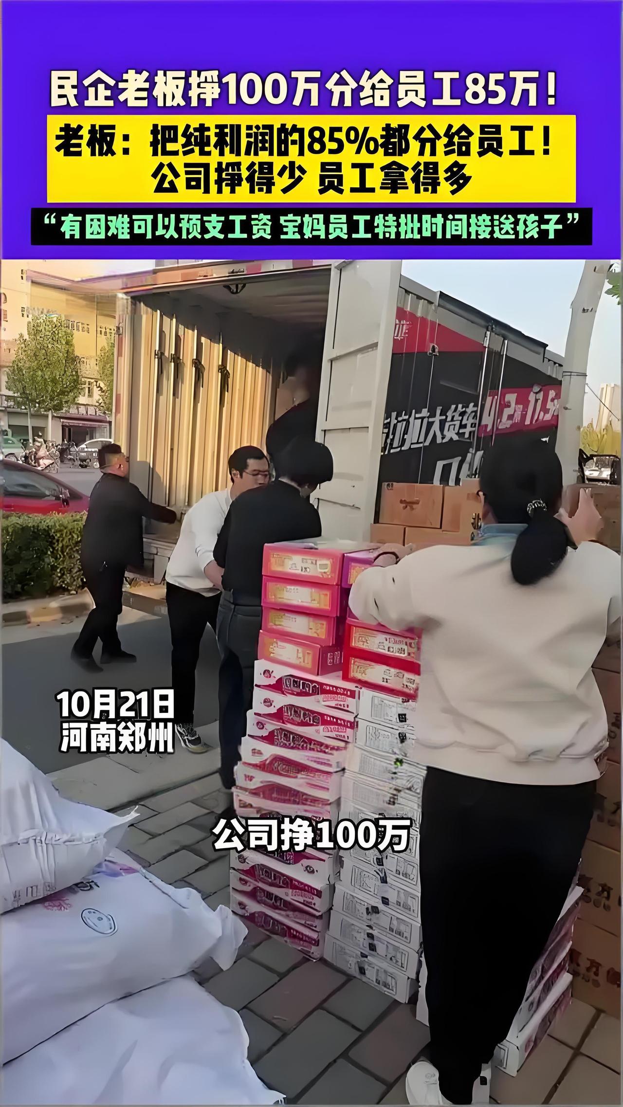 河南老板豪气分钱!这样的老板请给我来一打! 最近河南一位老板火了!他一年挣了100万,竟然拿出85万分给员工,自己只留15万。消息一出,全网炸锅:有人羡慕“又是别人家的老板”,有人算账直呼“这老板太实在”。据说,这位老板觉得员工辛苦付出值得回报,分钱时分得毫不犹豫。 说真的,这种老板简直是中国好老板的标杆!现在多少人嘴上说“员工是财富”,实际发钱时抠抠搜搜?这位老板却用行动打了他们的脸:钱是大家挣的,就该大家一起分! 更让人感动的是他的格局。不画大饼、不空谈情怀,直接真金白银砸向员工——这才是对努力最硬的尊重!想想那些“加班996、发钱123”的公司,脸疼吗? 咱们打工人要的从来不多:付出被看见,努力被认可。这样的老板,员工能不死心塌地跟着干?活该他赚钱! 这哪是分钱?分明是种下一片森林:老板赢了人心,员工拼了干劲。希望这样的“良心老板”能卷起来,让奋斗者不被辜负! 你遇到过这样的神仙老板吗?评论区等你晒故事!河南企业好老板 河南良心老板