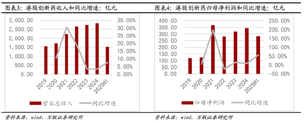 “经历了4年调整后,2025年上半年创新药行业迎来复苏。”据万联证券对39家港股创新药的样本数据,2025年上半年港股创新药公司总收入1520.61亿元(同比增长7.66%),归母净利润282.66亿元(同比大增54.37%)。