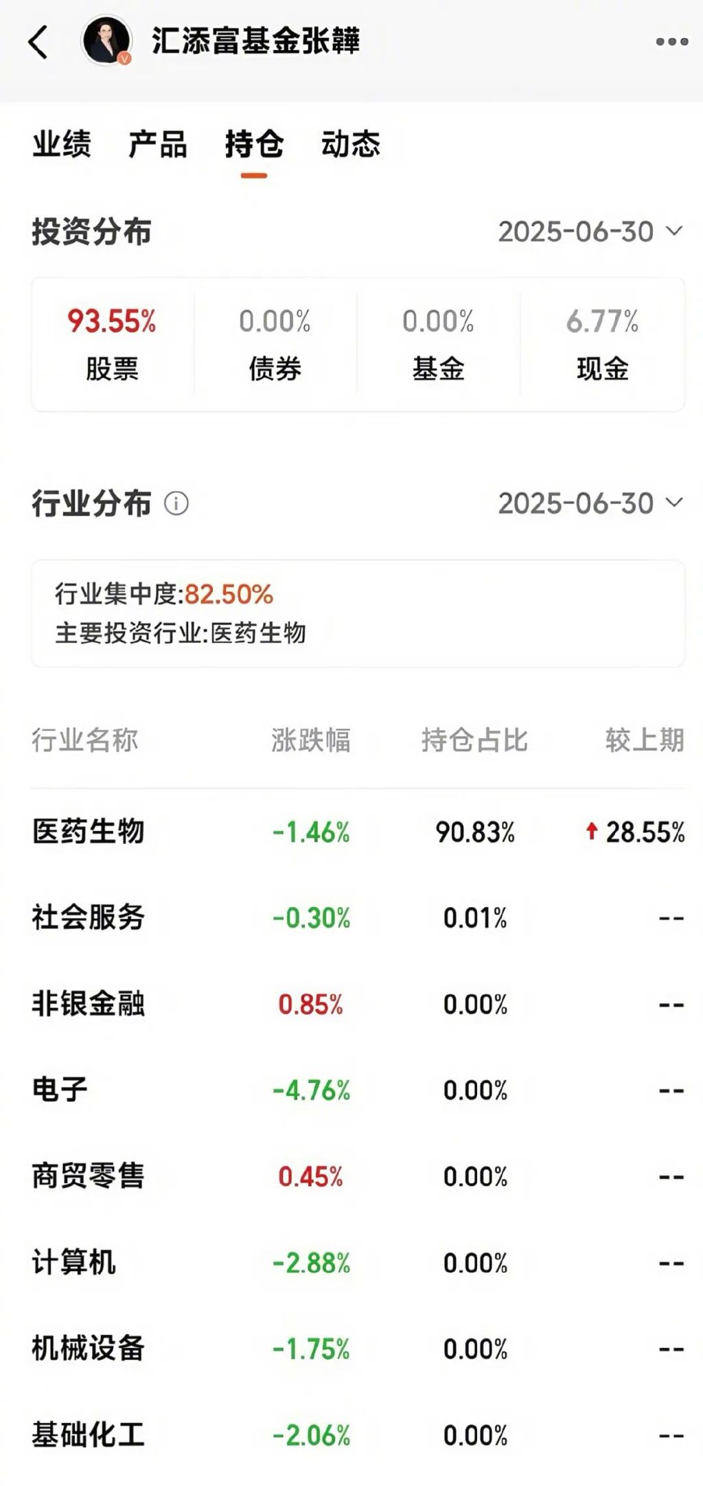 张韡管理的股票仓位中的医药生物行业占比高达90.83%