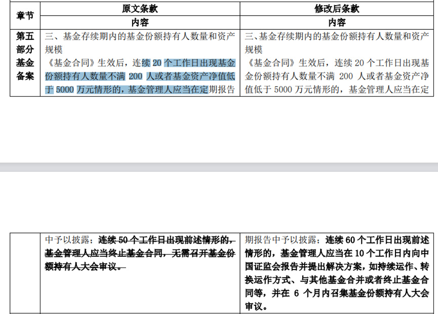 近期鹏华创新医药发了一则公告——修改基金终止条款。核心内容是删除了基金连续50个工作日规模低于5000万或者持有人数量少于200人就清盘的条款,改成了连续60后向证监会提交解决方案/