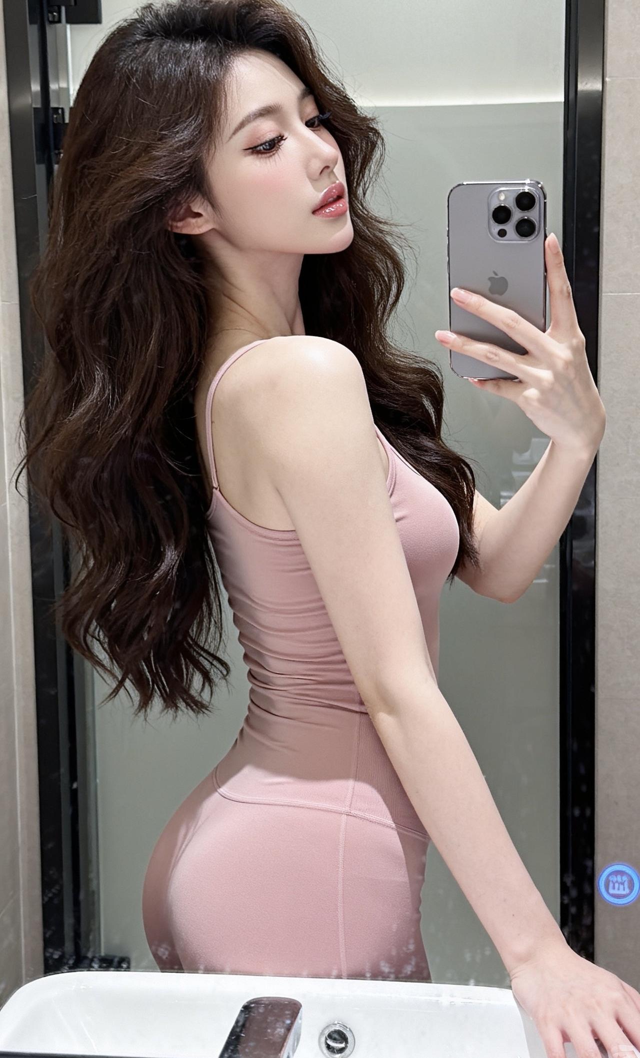 镜前轻倚,粉衣衬出曼妙身姿,卷发微扬,精致妆容衬得眉眼温柔,每一处细节都写满灵动魅惑。