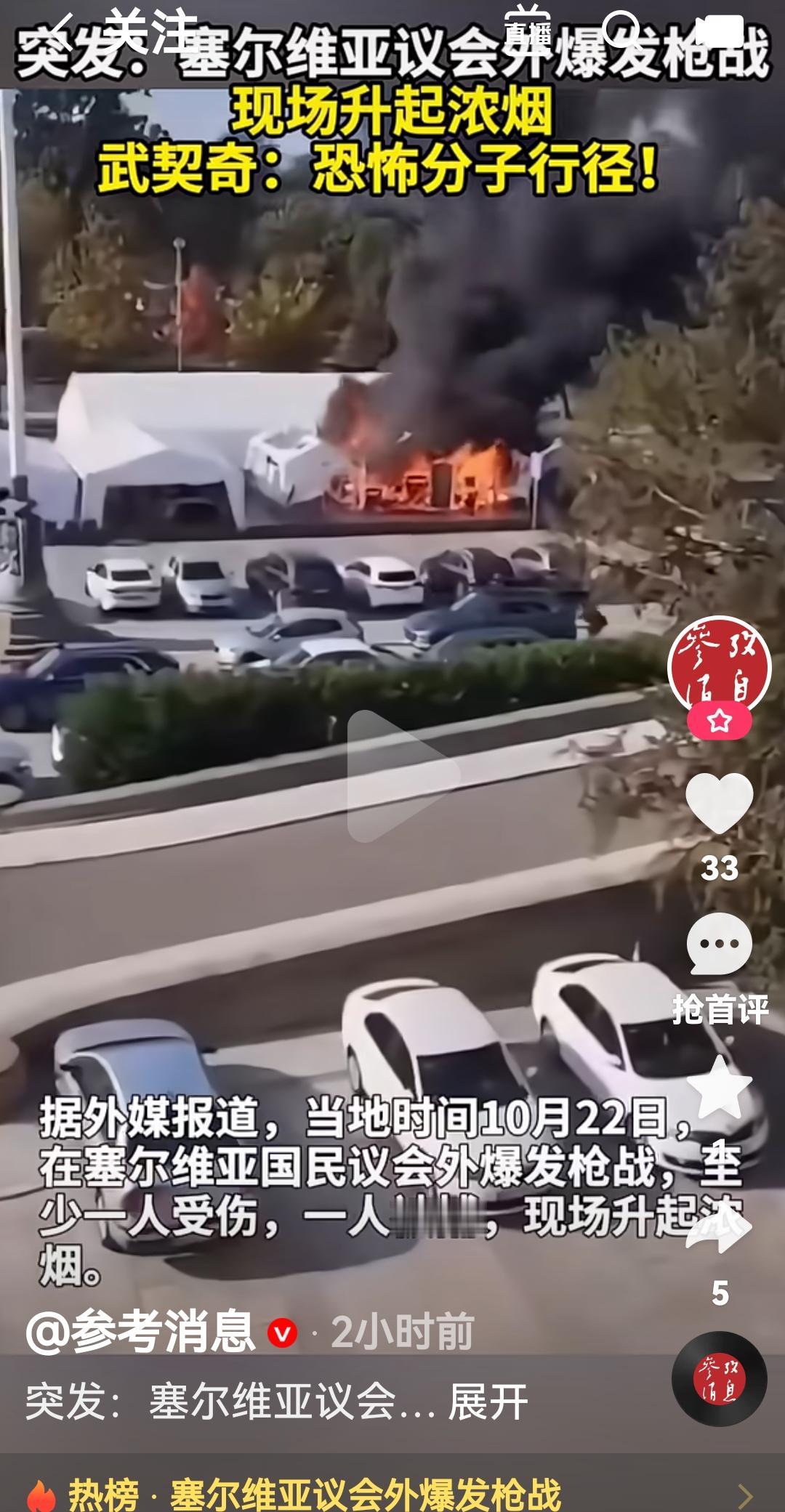 塞尔维亚议会外爆发枪战,浓烟滚滚 根据外国媒体报道,10月22日塞尔维亚国民议会外发生激烈枪战,至少一人死亡,一人受伤 塞尔维亚总统武契奇说这简直就是恐怖分子的手段 塞尔维亚这些年不容易,在北约的包围之中,怎么做都不行 这几年武契奇做的已经不错了,不然更麻烦塞尔维亚 塞尔维亚武契奇 塞尔维亚之变 图片来自参考消息视频