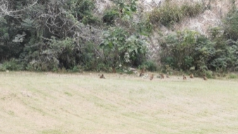 2019年6月,石岩山下萧山开元森泊度假酒店礼宾司朱然送客人时,看到一群猴子在草地上,至少有四五只。
