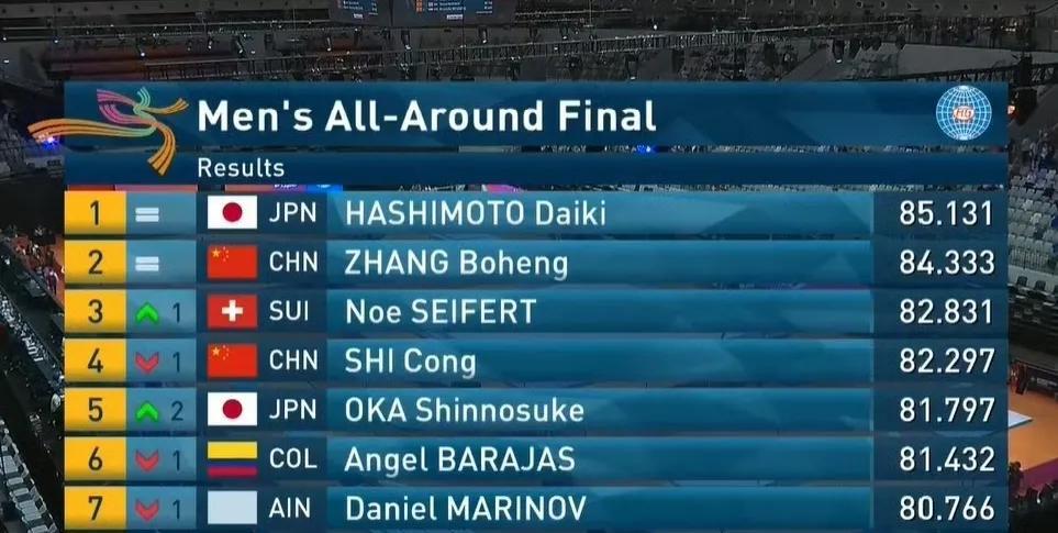 2025世界体操锦标赛,张博恒以总分84.333分获得亚军,日本队的桥本大辉以8