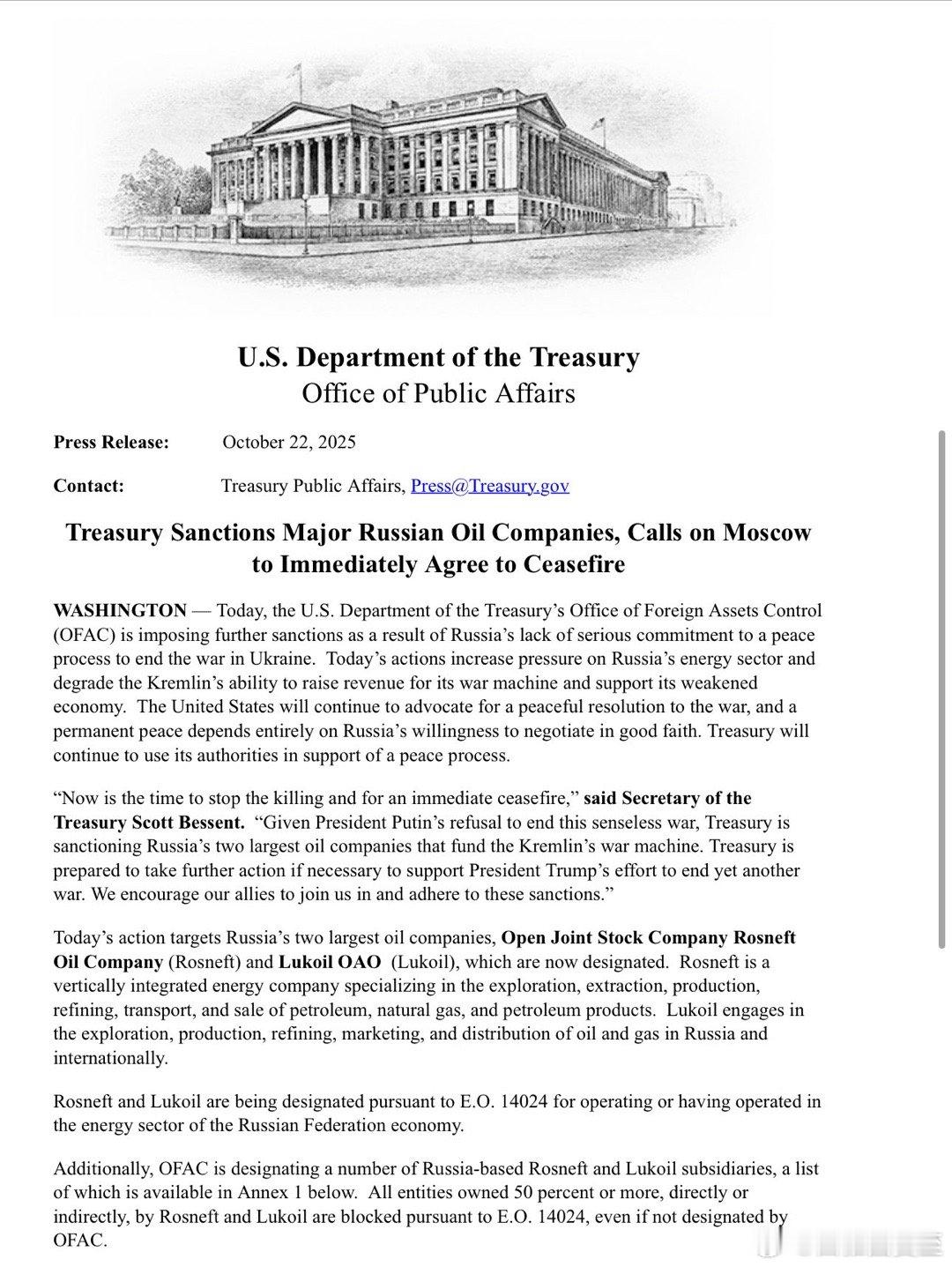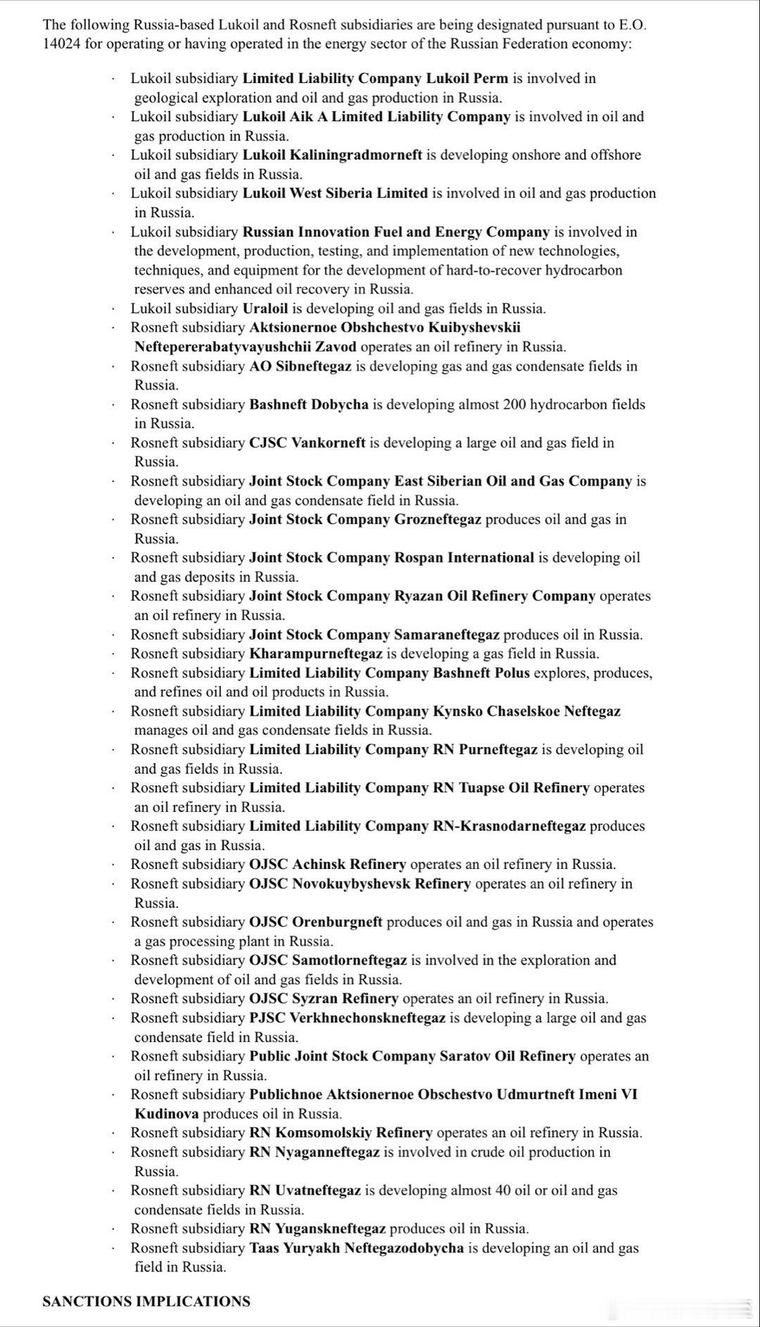 美国财政部官宣:制裁俄最大的两家石油公司及其子公司